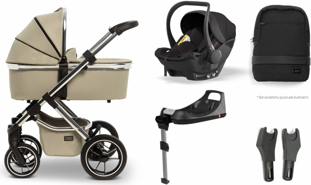 Set obsahuje: sportovní kočárek, hlubokou korbu, autosedačku Moon X1 plus, základnu isofix-Base, adaptéry, pláštěnku a batoh