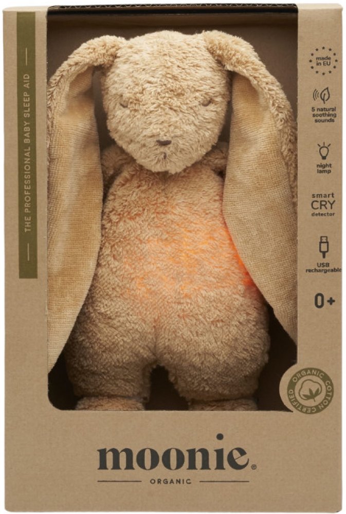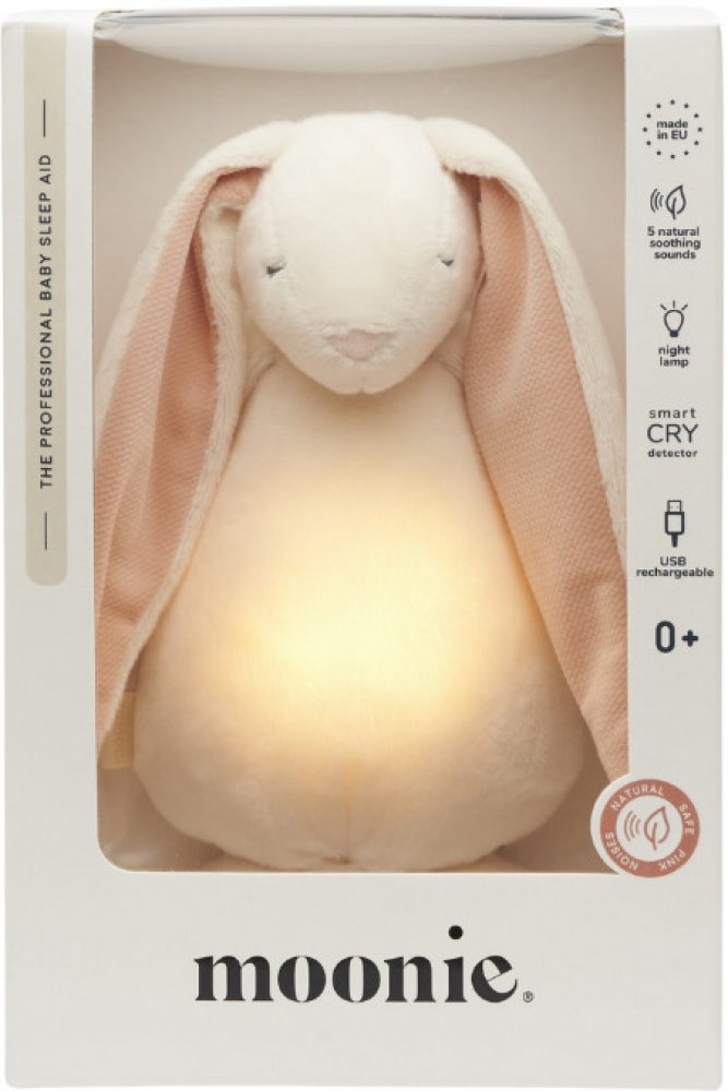 Moonie usínáček v podobě roztomilého zajíčka s nočním světlem a relaxačními zvuky pomáhá miminku uklidnit se a snáze usnout. Uklidňující zvuky připomínají dítěti prostředí v děloze maminky před jeho narozením. Usínáček nabízí pět přírodních relaxačních zvuků (tlukot srdce, vítr, lesní potok, mořské vlny, déšť), kalimba ukolébavku, dvě klasické ukolébavky a umožňuje nahrání vlastního hlasu.