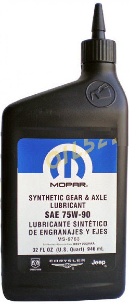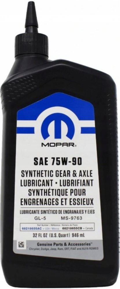 Převodový olej do diferenciálu 75W90 Mopar.Popis v angličtině:Specifically formulated for improved fuel efficiency while providing exceptional antiwear properties. For use in all FCA US LLC corporate axles.Norma:MS-9763Balení:946 ml (32 Oz.)OEM:68218655AC, 68218655CA, 04467707, 04549624, 05010320AA, 68218655AA