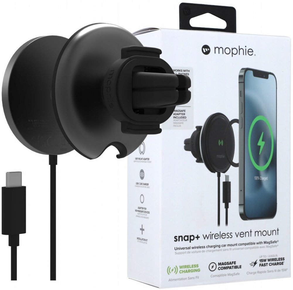 Mophie Snap+ je inovativní řešení, které kombinuje funkce držáku do auta, magnetické nabíječky a magnetického kroužku. Tento všestranný produkt umožňuje bezdrátové nabíjení s výkonem až 15W a je ideální pro montáž do ventilační mřížky automobilu. Je plně kompatibilní s technologií Apple MagSafe a díky přiloženému magnetickému kroužku Snap+ jej lze používat i se zařízeními podporujícími Qi nabíjení. A co víc, pokud máte na zařízení pouzdro silnější než 3 milimetry, nemusíte ho při nabíjení sundávat