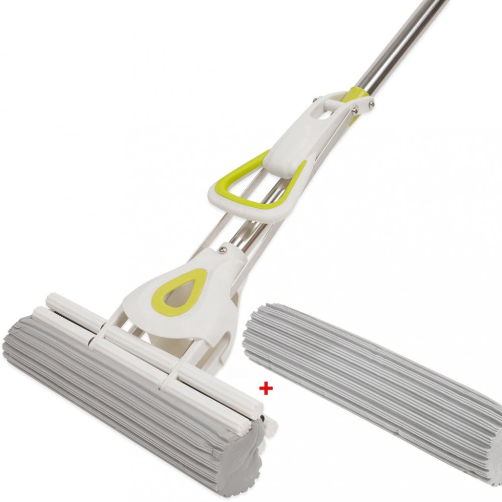 Univerzální mop pro všechny druhy tvrdých podlah v interiéru i exteriéru. Vysoce savá hlavice z PVA umožňuje vytření do sucha, výborně zachytí prach, chlupy a vlasy. Díky speciálnímu mechanismu na tyči lze mop snadno vyždímat bez namáčení rukou. Balení obsahuje 2 vytírací hlavice. Šířka záběru 27-28 cm. Teleskopická tyč, celková délka vč. hlavice cca 101 -132 cm. Hmotnost cca 0,7 kg.