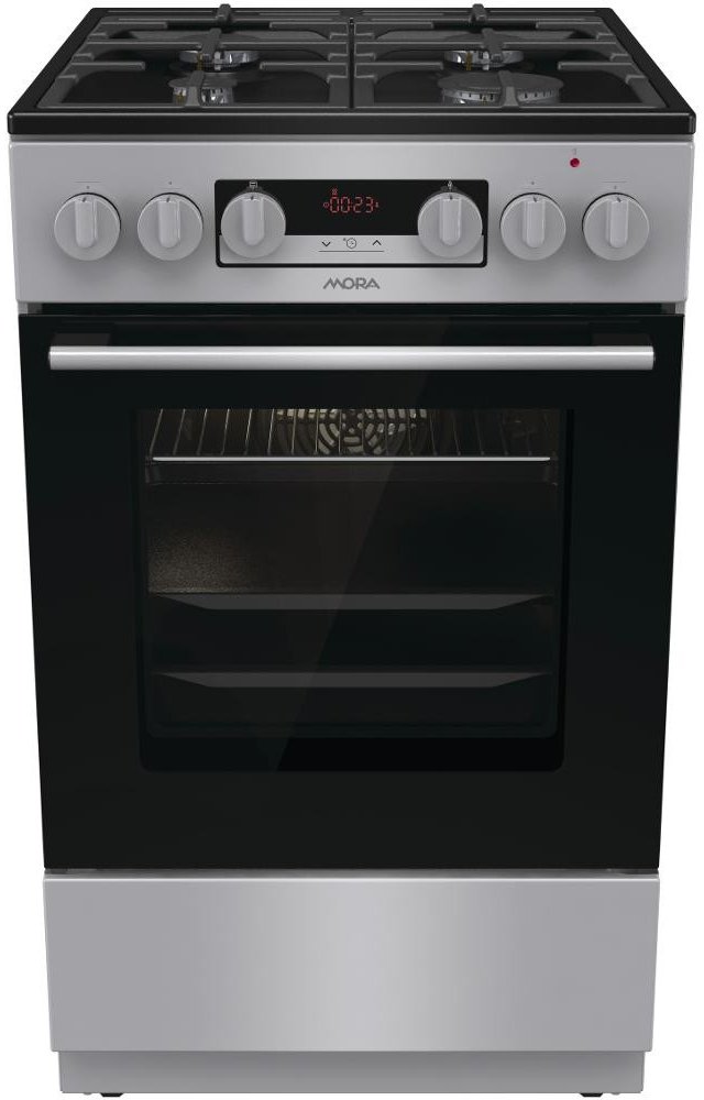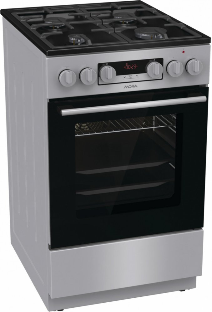 Kombinovaný sporák Mora K 8668 B1S v provedení INOX Look s multifunkční troubou v objemu 70 l Vás překvapí energeticky úspornou třídou A. Plynové hořáky s pojistkami STOP GAS a integrovaným zapalováním jsou kryté dvoudílnou mřížkou STABIL PLUS, která zajišťuje bezpečný posun nádobí ve všech směrech. Díky digitálnímu časovému spínači s hodinami se Vám již nikdy nespálí oběd, tato praktická funkce Vám přinese mnoho užitku. Lze nastavit odložený start a ukončení pečení, pouze ukončení pečení a minutka, samozřejmostí je nastavený aktuální čas. Disponuje funkcí páry, kterou ocení především příznivci zdravé výživy. Připravíte s ní jídla rychle a šetrně, takže si zachovají maximum vitamínů a stopových prvků. Dále je trouba vybavená 11 pečicími programy, které jsou navržené přesně podle potřeb konkrétních jídel. Vykouzlíte například výbornou pizzu jako z italské restaurace (program Pizza), pomalu upečete pečínku a efektivně rozmrazíte hotové porce jídla. Pokud si rádi pochutnáváte na hranolkách nebo kuřecích nugetách, ale nedopřáváte si je tak často kvůli vysoké kalorické hodnotě, můžete také zkusit program pro horkovzdušné fritování bez tuku. Hotovky většinou volíme tehdy, když nás tlačí čas. Se speciálním programem pro hotová a mražená jídla ho ušetříte ještě víc, protože si připravíte chutný oběd rychleji, bez nutnosti předehřívání trouby. Výsledek však bude dokonalý, a tak si v klidu vychutnáte třeba kuřecí nugety, lasagne, hranolky nebo croissanty. Zvykli jste si, že předehřátí trouby trvá celou věčnost? Na to teď zapomeňte. Tato trouba se předehřeje na 200 ˚C do 5 minut, což je mnohem rychleji, než bývá zvykem. Nové bezpečné závěsy dvířek zaručují bez Vaší asistence velmi tiché a šetrné zavírání dvířek trouby. Pro zvýšení komfortu obsluhy je trouba vybavená teleskopickým výsuvem, které umožní bezpečnou manipulaci s připravovaným jídlem, aniž byste ho museli z trouby vytáhnout. Ve spodní části sporáku je praktický úložný prostor, do kterého snadno uložíte příslušenství v podobě roštu, mělkého plechu a MAXI pekáče XXL o objemu až 8 l. Perfektní vyčištění vnitřního prostoru po každém pečení zajistí funkce ECO CLEAN, díky které odstraníte i větší nečistoty bez nutnosti použít čisticí prostředek.