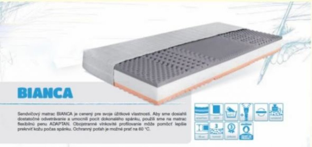Matrace Bianca BIANCA - Cenově dostupná sendvičová matrace s vynikající prodyšnostíMatrace BIANCA je skvělou volbou pro ty, kdo hledají kvalitní a pohodlnou matraci za přijatelnou cenu. Je navržena s ohledem na vysokou prodyšnost a komfort, který zajišťuje pohodlný spánek po celou noc.