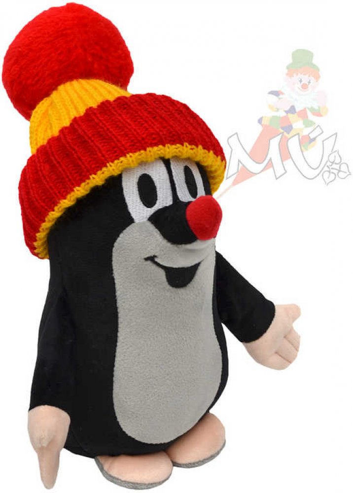Plyšový maňásek mírně vycpaný, se sundavací žluto-červenou čepicí, výška 30cm.
