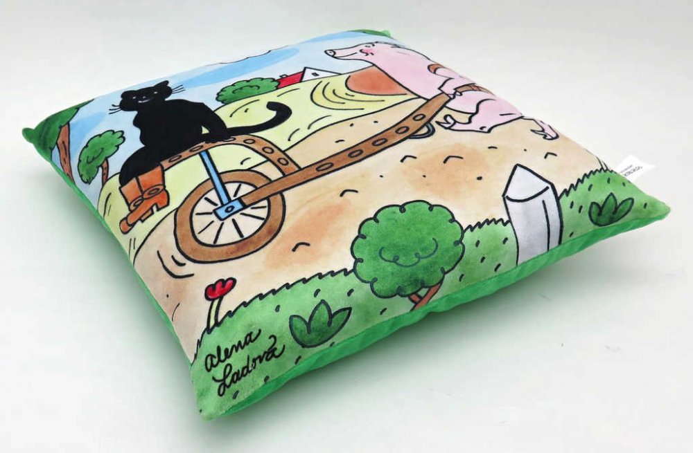 Měkoučký polštářek s motivem kocoura Mikeše podle předlohy Aleny Ladové. Vhodný do postýlky, na cesty i jako dekorace do pokojíčku. Zadní strana zelená.