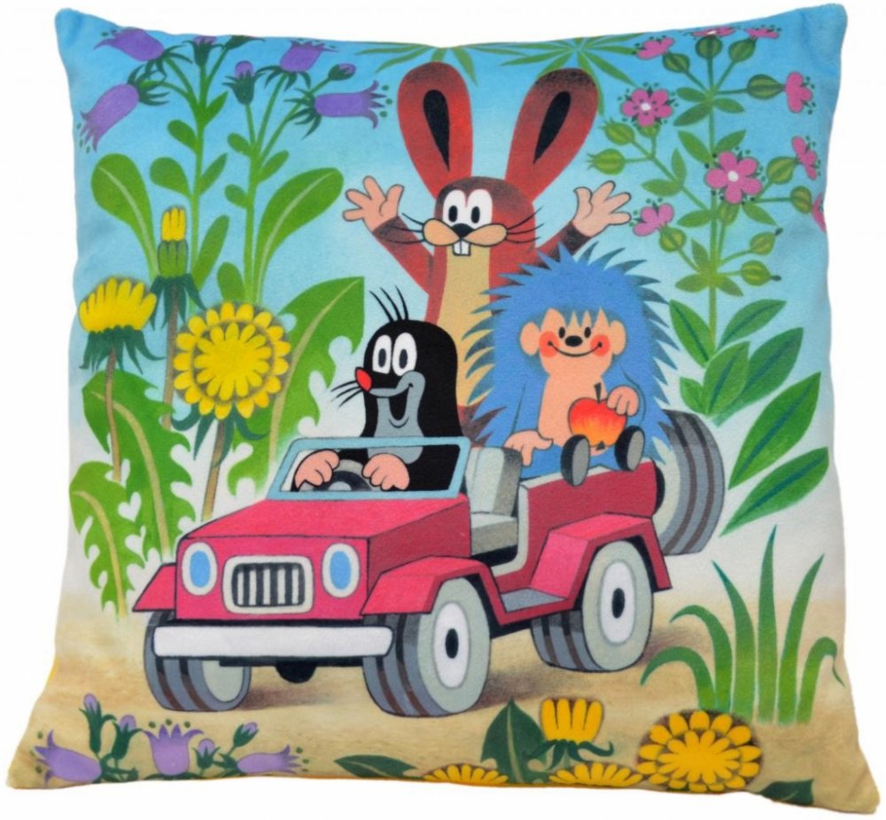 Měkoučký polštářek s motivem Krtečka a myšky v autíčku, vhodný do postýlky, na cesty i jako dekorace do pokojíčku. Materiál mikrovelur, obrázek tisk, náplň duté vlákno. Zadní strana žlutozelená. Pratelný.