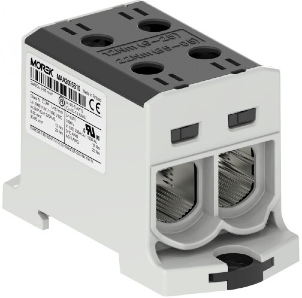 Univerzální řadové svorky OTL jsou určeny pro měděné a hliníkové vodiče. Svorky jsou vhodné pro všechny typy měděných nebo hliníkových vodičů s průřezem do 300 mm². Do univerzálních řadových svorek OTL je možné umístit měděné vodiče i v počtu více kusů dle příslušného typu svorky (viz tabulka připojitelnosti vodičů do univerzálních řadových svorek OTL na str. 9). Univerzální řadová svorka OTL 95-2xAl/Cu 6-95mm² 1000V černá Objednací číslo MAA2095S10 EAN 4744397014146 Barevný odstín Černá Materiál vodiče Al/Cu Rozsah upínaných vodičů min. (mm²) 6 Rozsah upínaných vodičů max. (mm²) 95 Vstupní vodič min. (mm²) 6 Vstupní vodič max. (mm²) 95 Výstupní vodič min. (mm²) 6 Výstupní vodič max. (mm²) 95 Počet připojovacích míst 4 Jmenovitý proud (A) 245 (Cu) / 220 (Al) Jmenovité napětí (V) 1000 Provozní teplota (°C) 80 Materiál Pocínovaný hliník, polyamid PA6 Způsob uchycení Lišta DIN, šroub Šířka (mm) 42 Délka (mm) 84 Výška (mm) 51 Hmotnost (g) 125 Šroub, inbus Hex 6 Utahovací moment (Nm) 12 Nm (6 - 25 mm²)22 Nm (35 - 95 mm²) Stupeň krytí IP20 Certifikace EN 61238-1; EN60947-7-1 Klasifikace hořlavosti UL94 V0 Celní kód CN8 85369010 Balení (ks) 15