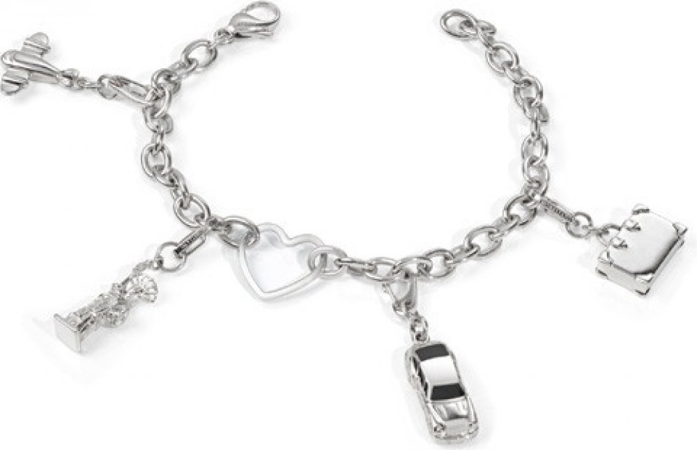 Hezký náramek z chirurgické oceli je tvořen řetízkem a přívěsky. Řetízek je navíc proložen jedním článkem v podobě srdíčka. Jsou zde celkem čtyři veselé přívěsky, mimo jiné napříkla letadlo nebo kufr. Délka řetízku je 20 cm, zapínání šperku je na karabinku. Tento náramek je dodáván v originální krabičce značky Morellato.