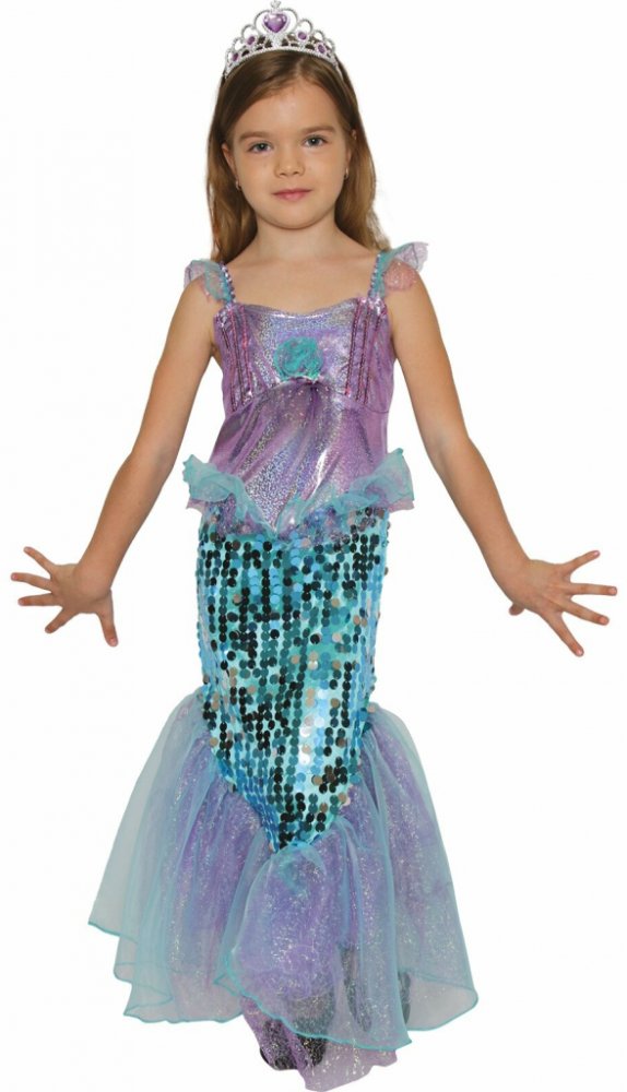 Dětský kostým Mořská panna s korunkou ve velikosti 7-9 let potěší všechny holčičky, které milují podmořský svět nebo pohádku o malé mořské víle Ariel. Velikosti: 7-9 let Materiál: 100% polyester Balení obsahuje: šaty s flitry a skládací korunku s drahokamy Nevhodné pro děti do 3 let.