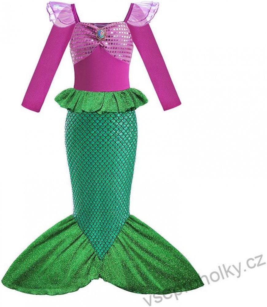 Dětský nádherný kostým šaty mořské panny Ariel. Pružný pohodlný materiál zaručí bezproblémový pohyb - vršek je zepředu saténový, zezadu a pas pružný, spodek je celý pružný. Zdobení organzou vytváří vzhled ploutve. Karneval, holčičí přespávání, či narozeninová oslava tak bude o to pohádkovější.