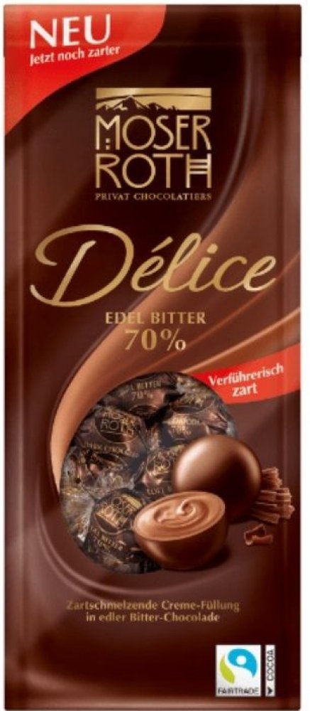 Moser Roth Delice - pralinky z hořké čokolády 70 s krémovou náplní (44). Pralinky z hořké čokolády a krémové náplně jsou smyslnou kombinací intenzivní chuti hořké čokolády se sametovým, krémovým vnitřkem, který se rozpouští v ústech a poskytuje nezapomenutelný chuťový zážitek. Každá pralinka je malým kouskem čokoládového ráje, kde hluboká chuť dezertní čokolády dokonale ladí s bohatou, krémovou ná...