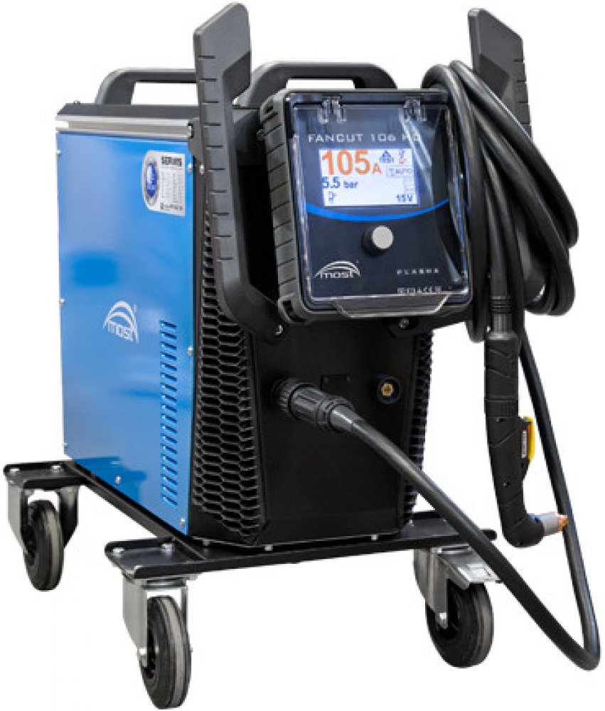 Plazmová řezačka Fancut 106 HD MOST FANCUT 106 HD je invertorový stroj pro plazmové řezání kovů. Maximální tloušťka řezu kovů je: uhlíková ocel: 50 mm, nerezová ocel: 45 mm, hliník: 35 mm, měď: 30 mm. Proces řezání plazmou je řízen z moderního panelu s displejem z tekutých krystalů. Kromě nastavení řezacího proudu můžete nastavit také provozní režim (kontinuální řezání, řezání sítě nebo drážkování...