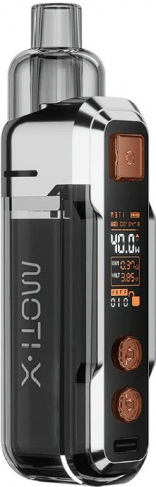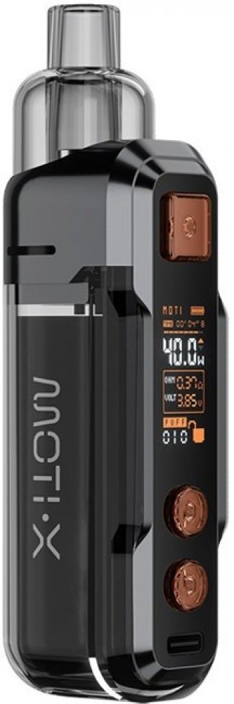 Moti X Pod Kit je výkonný pod systém, který ocení zejména milovníci utaženějšího přímého potahování do plic. Pracuje s výstupním výkonem až 40 W. Výkon je navíc možné regulovat, můžete si ho tak podle potřeby snížit, nebo zase zvýšit. Pro regulaci poslouží dvě velká kulatá tlačítka umístěná přímo pod displejem zařízení na předním ovládacím panelu.