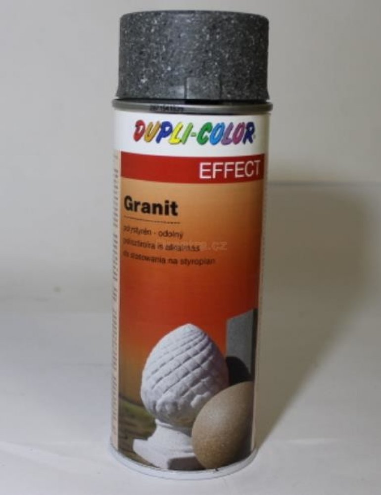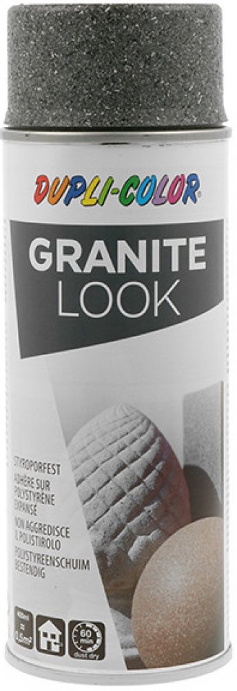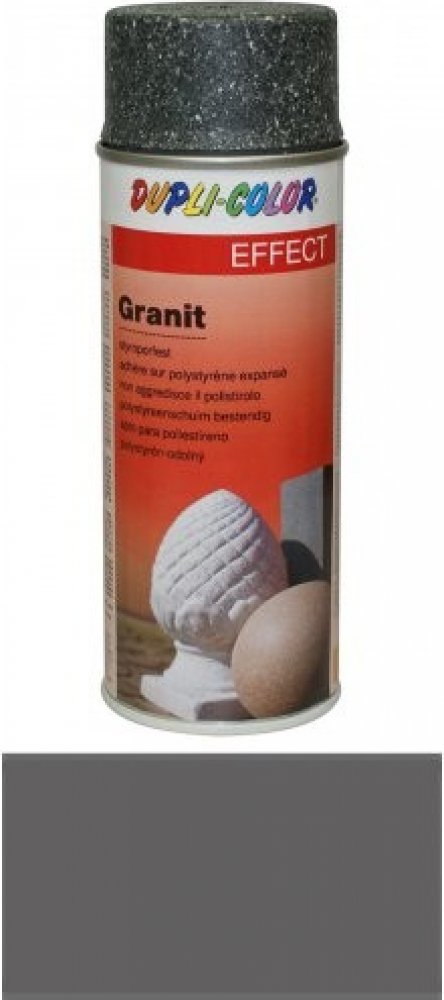 Sprej značky Dupli color v objemu 400 ml, který vytváří granitový vzhled, neboli efekt kamene. Sprej je na vodní bázi a je tedy možné ho použít na téměř všechny druhy materiálů, jako dřevo, kov, sklo, keramiku, porcelán, papír, lepenku, kámen, plasty a dokonce i na rozšířený polystyren. Barvy je bez zápachu a lze ji umýt vodou do 30 minut od aplikace. Po zaschnutí vytváří matný, strukturovaný povr...