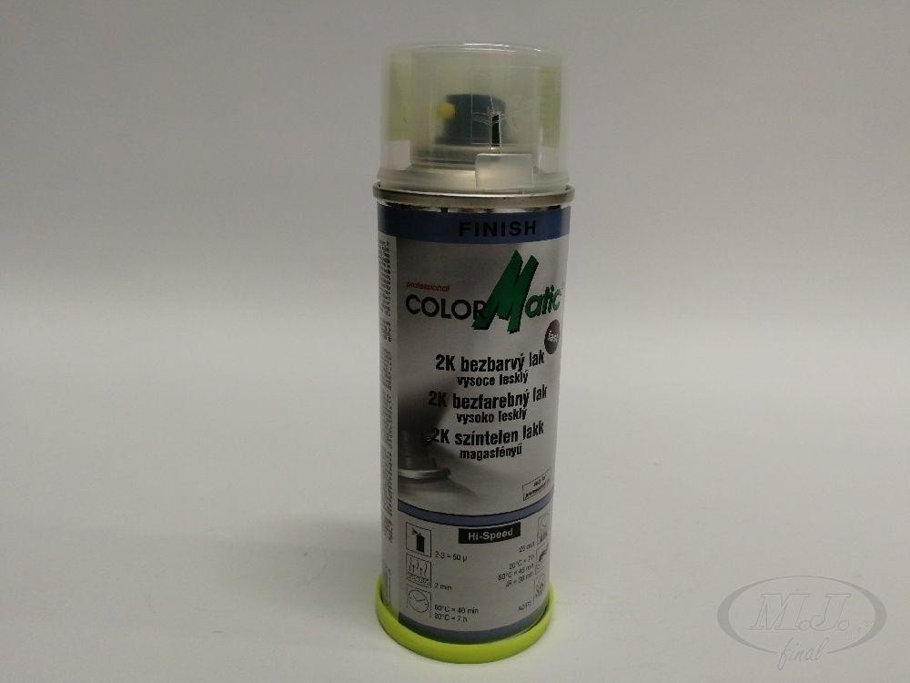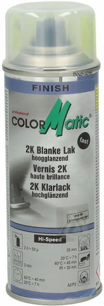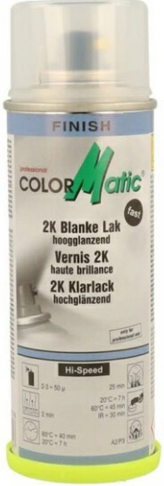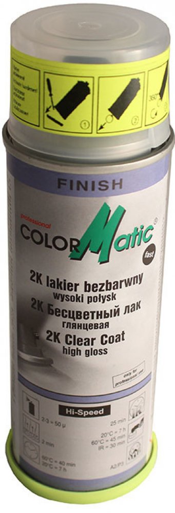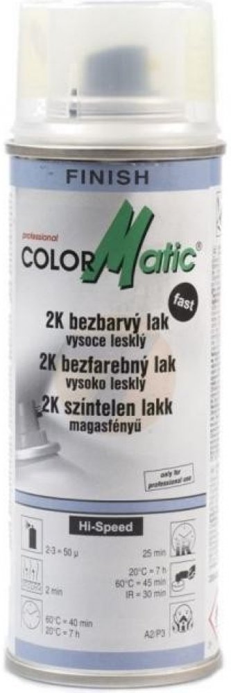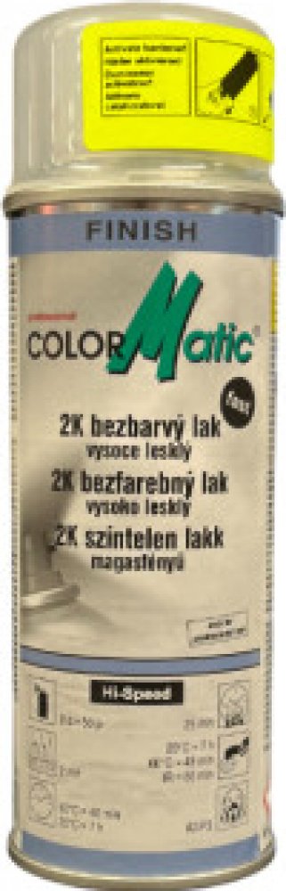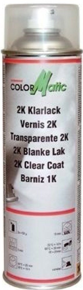 ColorMatic 2K bezbarvý lak s vysokým leskem extrémně odolný proti poškrábání. Dvoukomponentní bezbarvý lak s velmi vysokou odolností proti benzínu, UV záření a povětrnostním vlivům. Vzhledem ke svému rychlému schnutí má velmi dobrý rozliv a snadno se leští. ColorMatic 2K čirý lak je vhodný zejména pro bodové opravy. Pro bodové opravy použijte i Spot blender. Předplněné ColorMatic spreje můžou být přelakovány pomocí 2K laku po cca 30 minutách. Předchozí vrstva musí být však zcela proschlá.