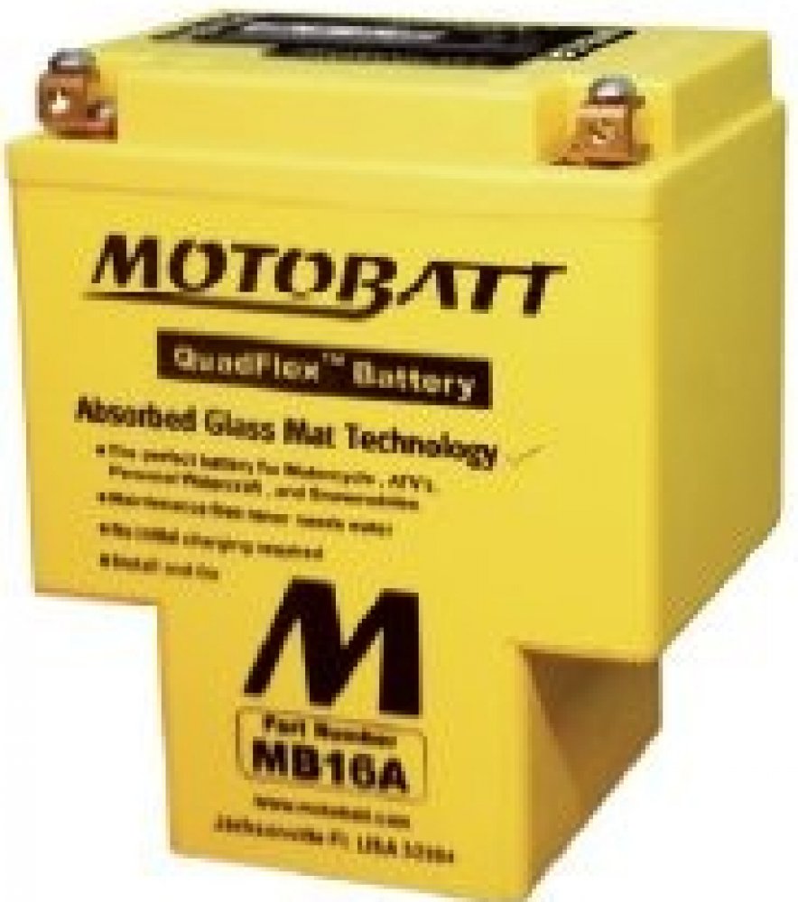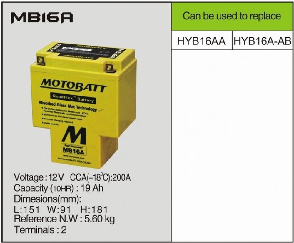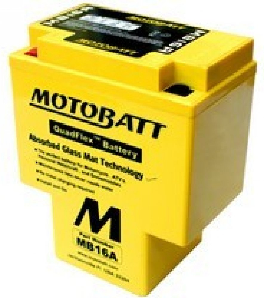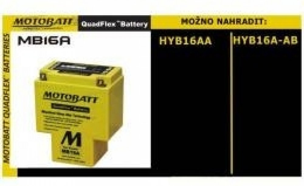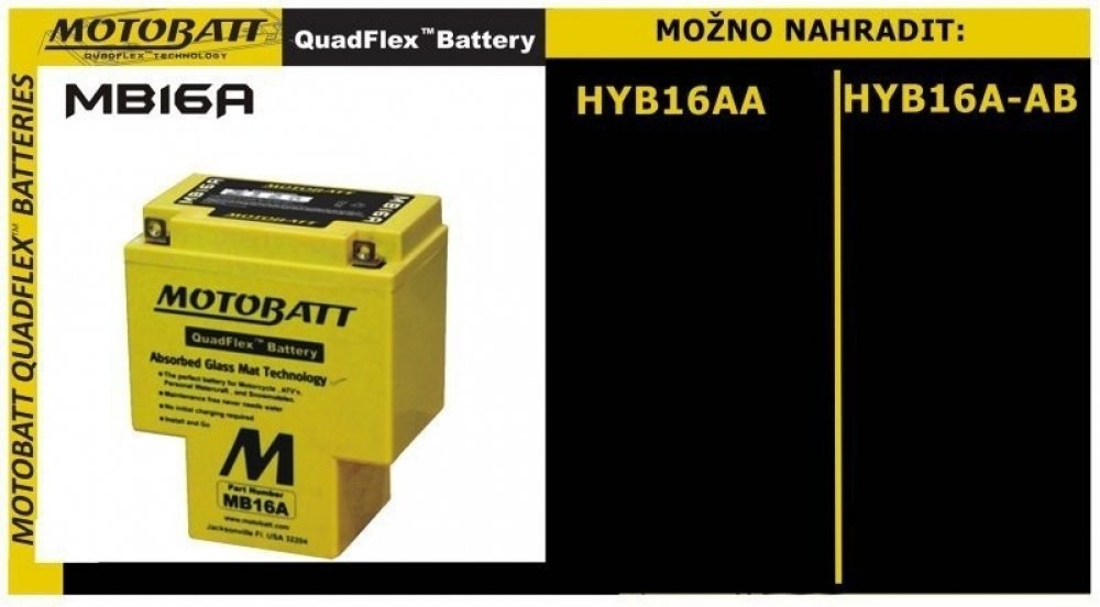 Baterie Motobatt pro motocykly MB16A (17,5Ah, 12V, 2 vývody)Motobaterie MOTOBATT MB16A 19Ah náhrada baterií: HYB16A-AB, HYB16A-A, MB16A s vyšší kapacitou oproti konkurenčním akumulátorům, při zachování velikosti a AGM technologií (elektrolyt napuštěn ve skelném rouně) umožňuje variabilní umístění baterie, tzn. může být nakloněna, nebo i ležet.