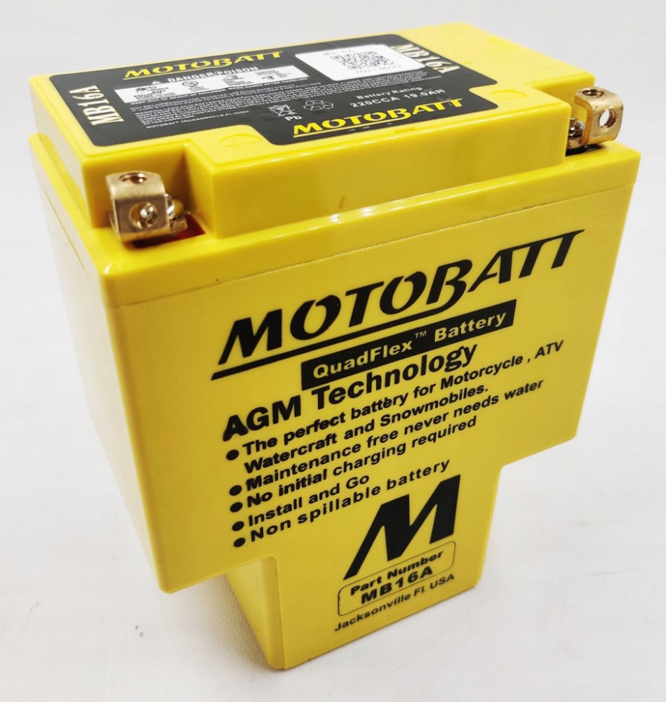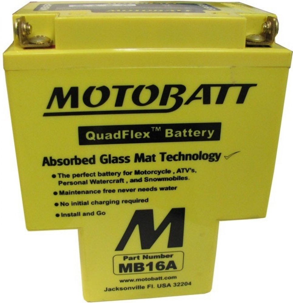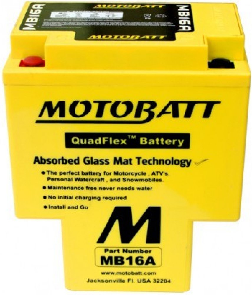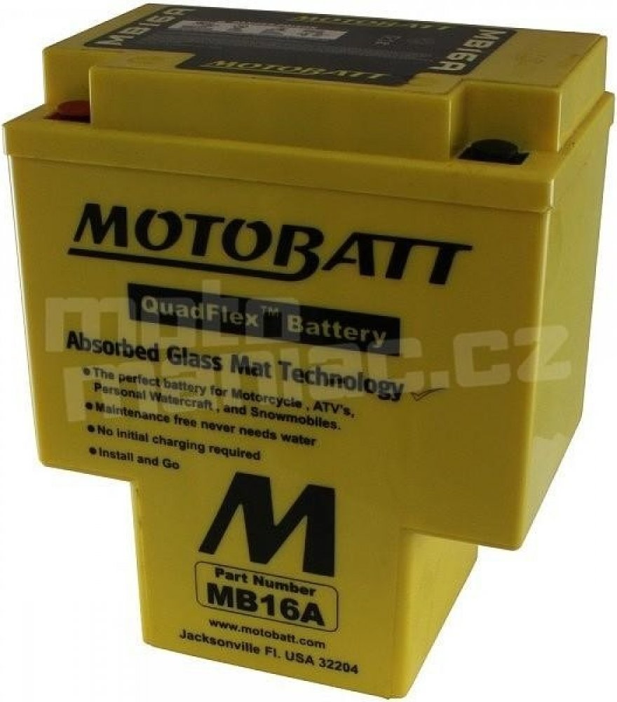 Baterie Motobatt pro motocykly MB16A (17,5Ah, 12V, 2 vývody)Motobaterie MOTOBATT MB16A 19Ah náhrada baterií: HYB16A-AB, HYB16A-A, MB16A s vyšší kapacitou oproti konkurenčním akumulátorům, při zachování velikosti a AGM technologií (elektrolyt napuštěn ve skelném rouně) umožňuje variabilní umístění baterie, tzn. může být nakloněna, nebo i ležet.