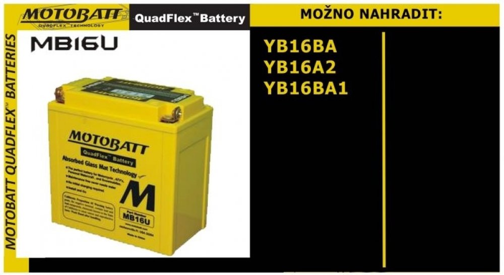 Motobaterie MOTOBATT MB16U 20Ah náhrada baterií: CB16B-A, CB16B-A1, CB16B-A2, MB16U s vyšší kapacitou oproti konkurenčním akumulátorům, při zachování velikosti a AGM technologií (elektrolyt napuštěn ve skelném rouně) umožňuje variabilní umístění baterie, tzn. může být nakloněna, nebo i ležet.