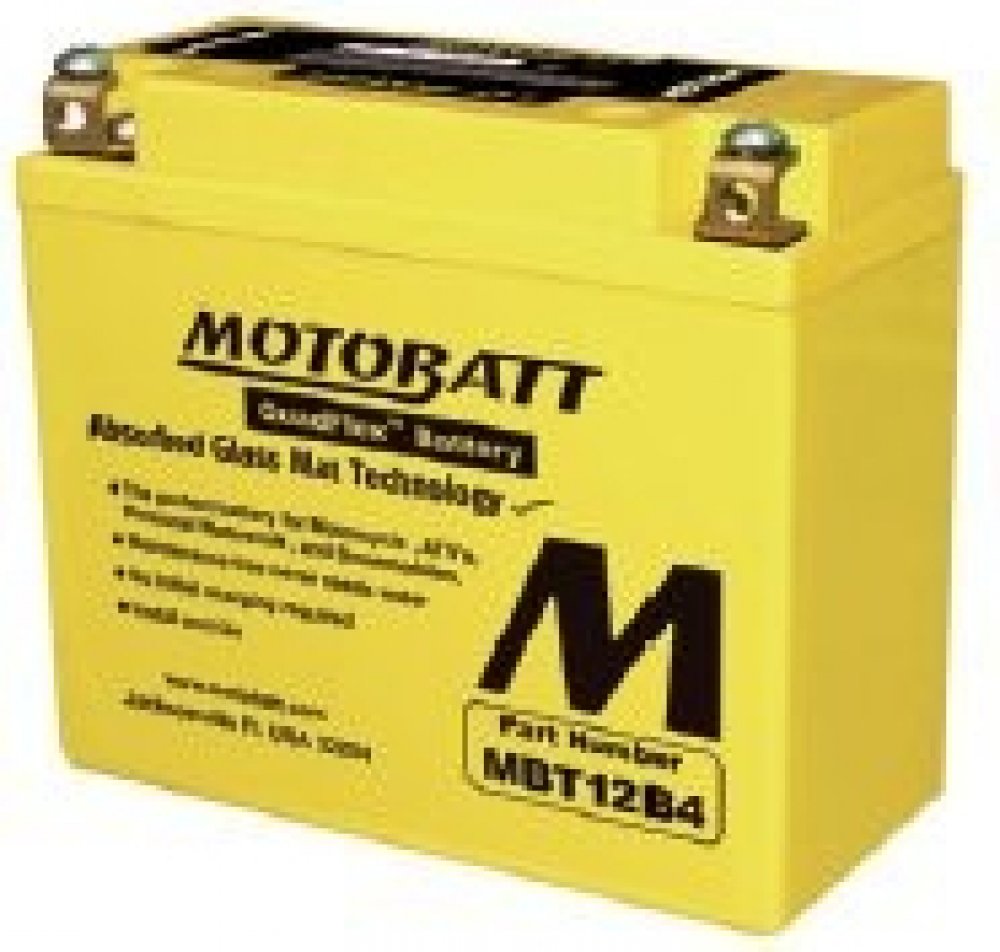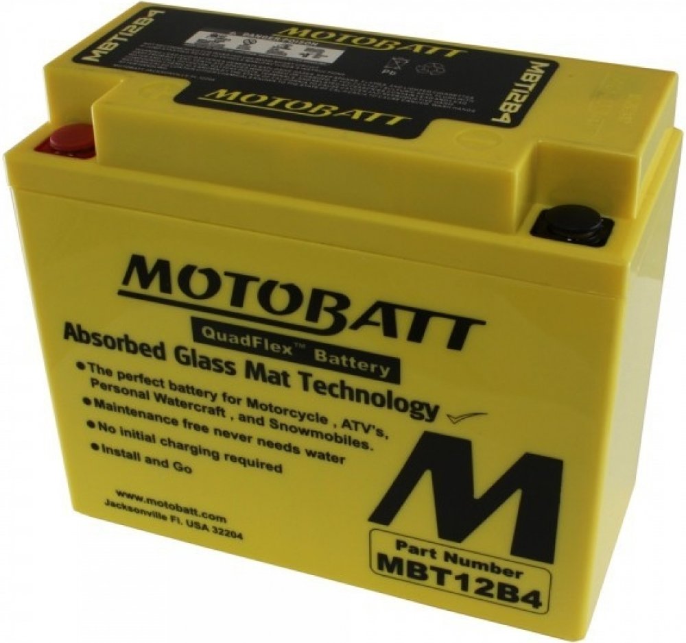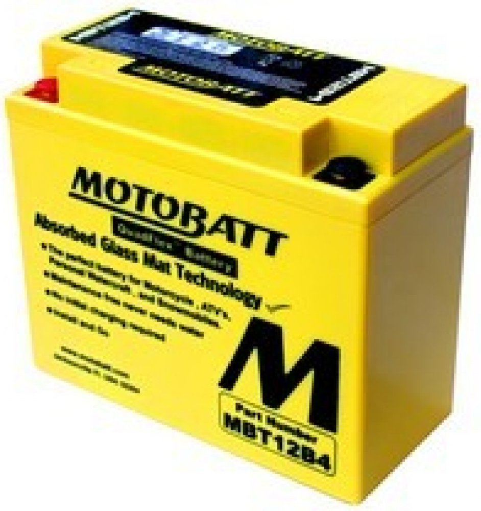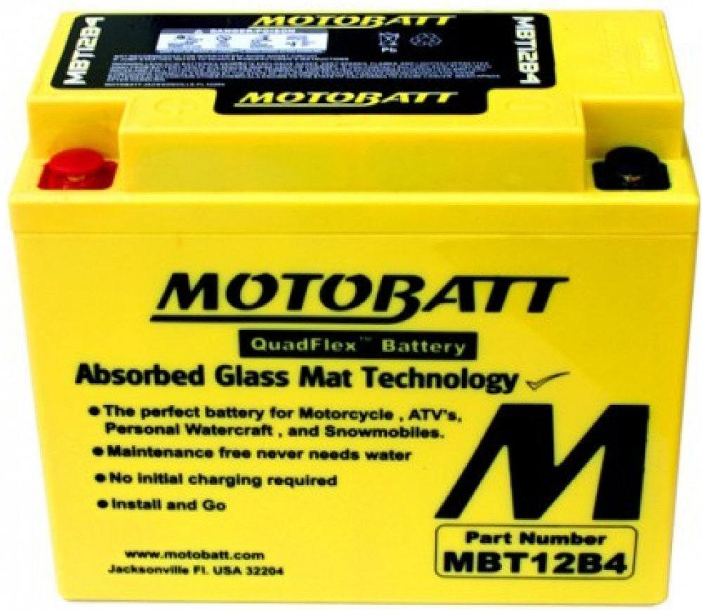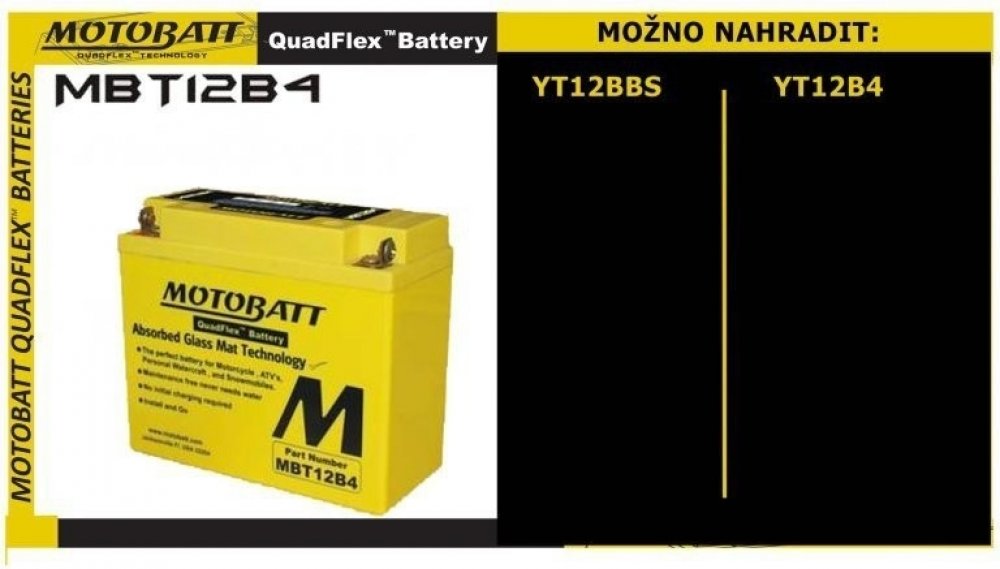 Motobaterie MOTOBATT MBT12B4 11Ah náhrada baterie YT12B-BS s vyšší kapacitou oproti konkurenčním akumulátorům, při zachování velikosti a AGM technologií (elektrolyt napuštěn ve skelném rouně) umožňuje variabilní umístění baterie, tzn. může být nakloněna, nebo i ležet.
