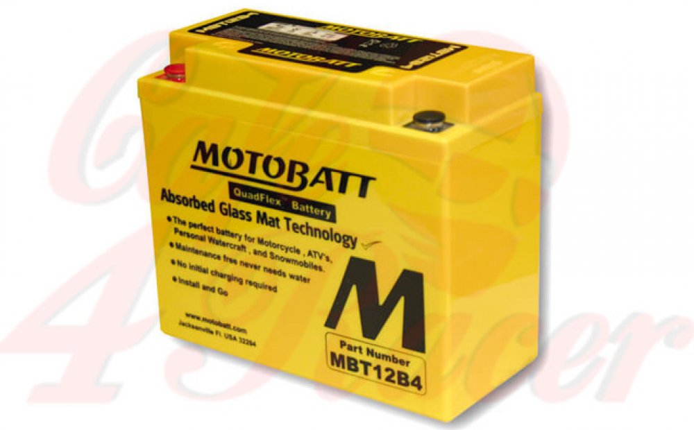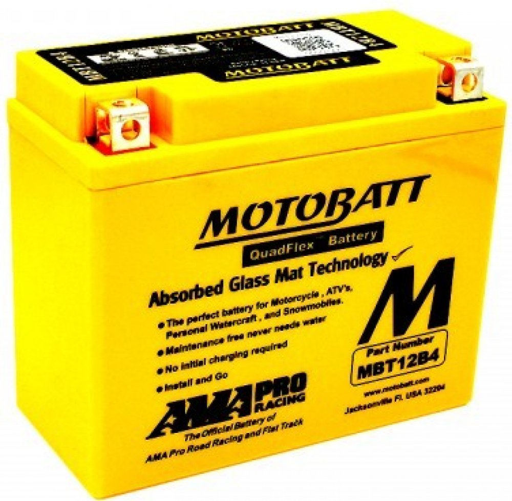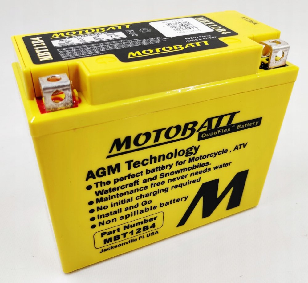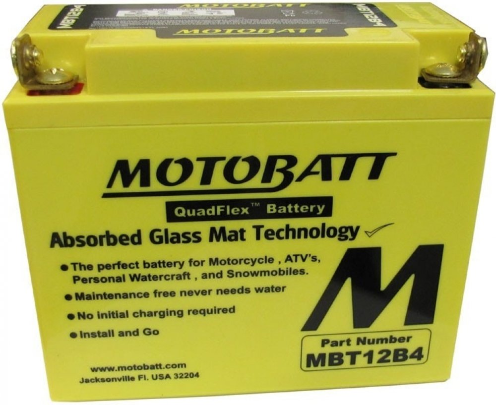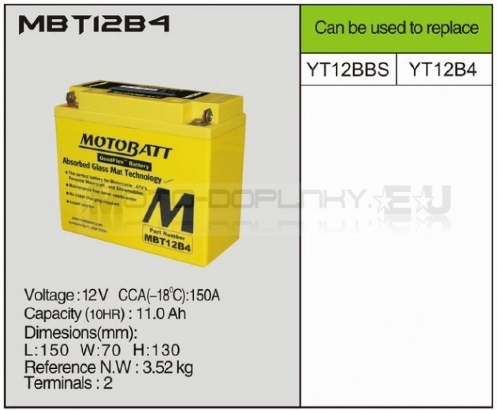 Motobaterie MOTOBATT MBT12B4 11Ah náhrada baterie YT12B-BS s vyšší kapacitou oproti konkurenčním akumulátorům, při zachování velikosti a AGM technologií (elektrolyt napuštěn ve skelném rouně) umožňuje variabilní umístění baterie, tzn. může být nakloněna, nebo i ležet.