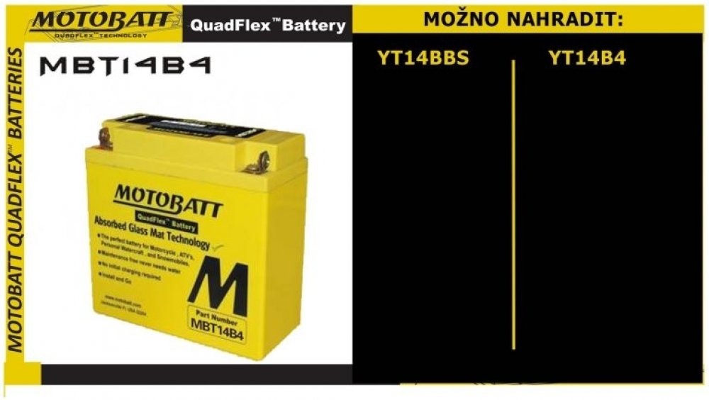 Motobaterie MOTOBATT MBT14B4 13Ah náhrada baterií: YT14BBS, YT14B4, MBT14B4 s vyšší kapacitou oproti konkurenčním akumulátorům, při zachování velikosti a AGM technologií Motobaterie MOTOBATT MBT14B4 13Ah náhrada baterií: YT14BBS, YT14B4, MBT14B4 s vyšší kapacitou oproti konkurenčním akumulátorům, při zachování velikosti a AGM technologií (elektrolyt napuštěn ve skelném rouně) umožňuje variabilní...