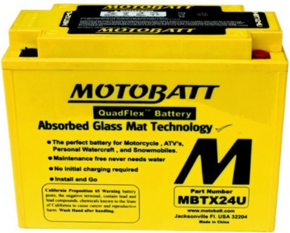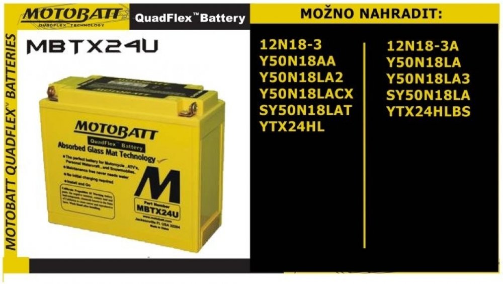 Motobaterie MOTOBATT MBTX24U 25Ah náhrada baterií: 12N18-3 ,12N18-3A, Y50N18AA, Y50N18LA, Y50N18LA-2, Y50N18LA-3, Y50N18LACX, SY50N18LA, SY50N18LAT, YTX24HL, YTX24HL-BS, MBTX24U s vyšší kapacitou oproti konkurenčním akumulátorům, při zachování velikosti a AGM technologií (elektrolyt napuštěn ve skelném rouně) umožňuje variabilní umístění baterie, tzn. může být nakloněna, nebo i ležet.