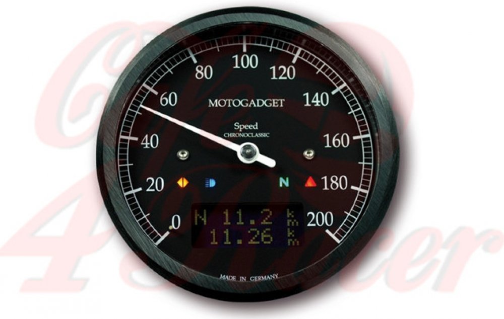 Motogadget Chronoclassic Tachometr 0-200 km/h, číselník a prstenec černý, černý LC displej