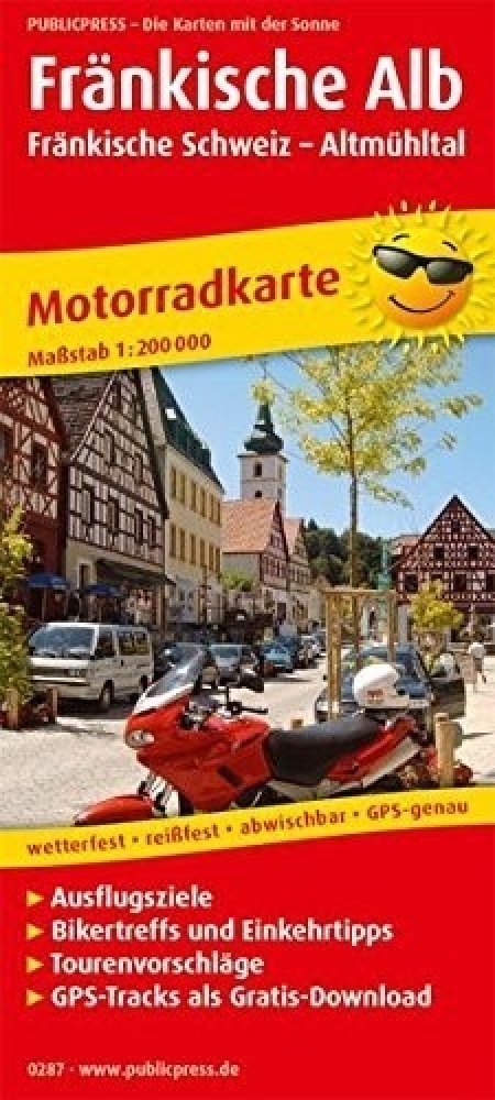 Německý výrobek z vydavatelství Publicpress je navržen speciálně pro motorkáře. Je to rozkládací mapa pohoří Franská Alba (též Franský Jura, cca okolo Norimberku), na níž je vyznačeno 8 mototras různé délky (každá 135 - 170 km). Mapa je vyrobena z voděodolného materiálu.
