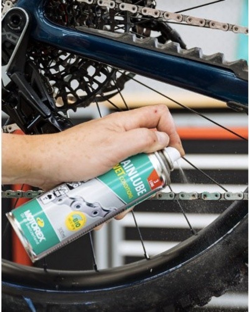 Na suchý, vyčištěný řetěz naneste MOTOREX CHAINLUBE FOR MOKRÉ PODMÍNKY. Během toho pohybujte klikami tak, aby se mazivo nanášelo rovnoměrně. Znečištěný řetěz lze snadno vyčistit pomocí MOTOREX BIKE CHAIN DEGREASER.