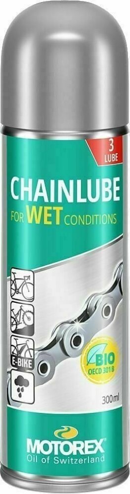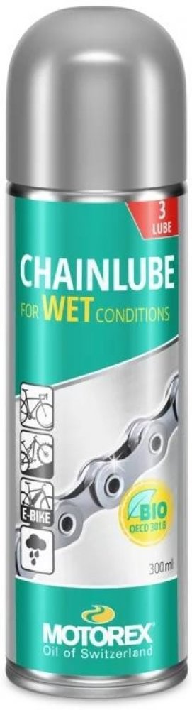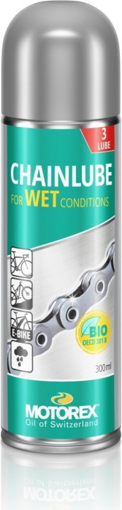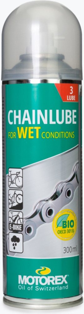 Biologicky odbouratelné, plně syntetické mazivo. MOTOREX WET CONDITIONS obsahuje přísady, které mu umožňují rychle a hluboce proniknout. Poskytuje optimální mazání a vynikající ochranu proti korozi. Speciálně vyvinutý pro jízdní podmínky, kde musí mazivo dlouhodobě ulpívat na řetězu. Mazivo je vysoce vodoodpudivé, takže je ideální pro vlhké a blátivé podmínky.