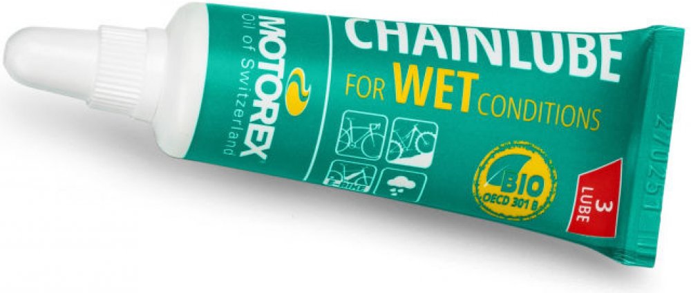 Biologicky odbouratelné, plně syntetické mazivo. MOTOREX WET CONDITIONS obsahuje přísady, které mu umožňují rychle a hluboce proniknout. Poskytuje optimální mazání a vynikající ochranu proti korozi. Speciálně vyvinutý pro jízdní podmínky, kde musí mazivo dlouhodobě ulpívat na řetězu. Mazivo je vysoce vodoodpudivé, takže je ideální pro vlhké a blátivé podmínky.