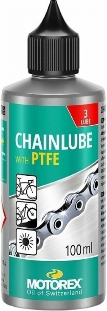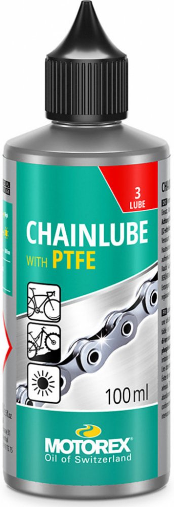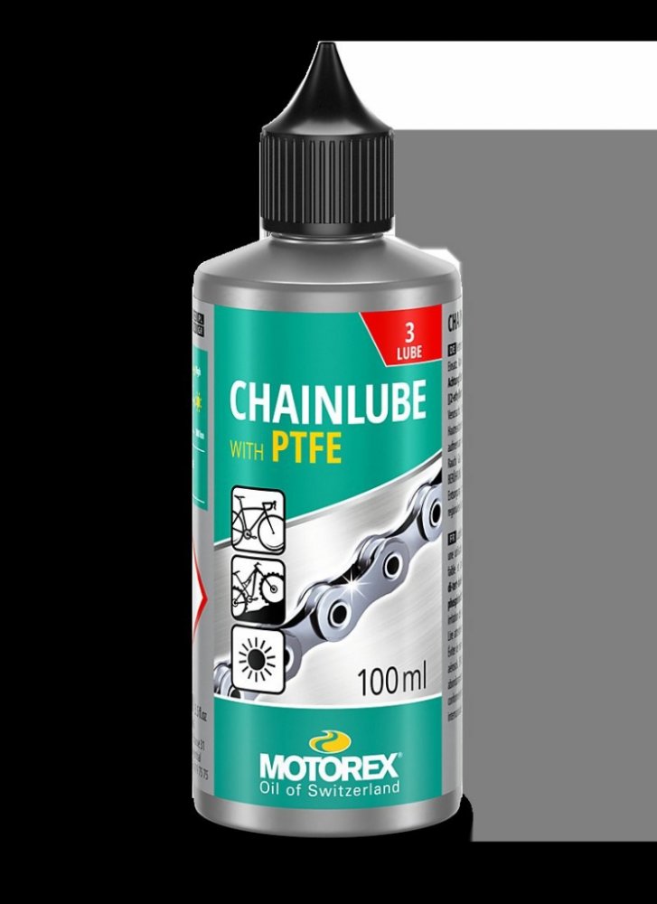 MOTOREX CHAINLUBE s PTFE je plně syntetické mazivo na řetězy s vysokou odolností proti prachu a nečistotám. Speciální složení s PTFE snižuje tření a přitom zajišťuje optimální mazání článků řetězu. Inovativní složení vysoce kvalitních aditiv umožňuje přesné a plynulé řazení. Je určen pro použití na silničních kolech, které jezdí pouze za sucha. Nicméně i horská kola mohou těžit z výkonu CHAINLUBE s PTFE, pokud jsou podobné klimatické podmínky.