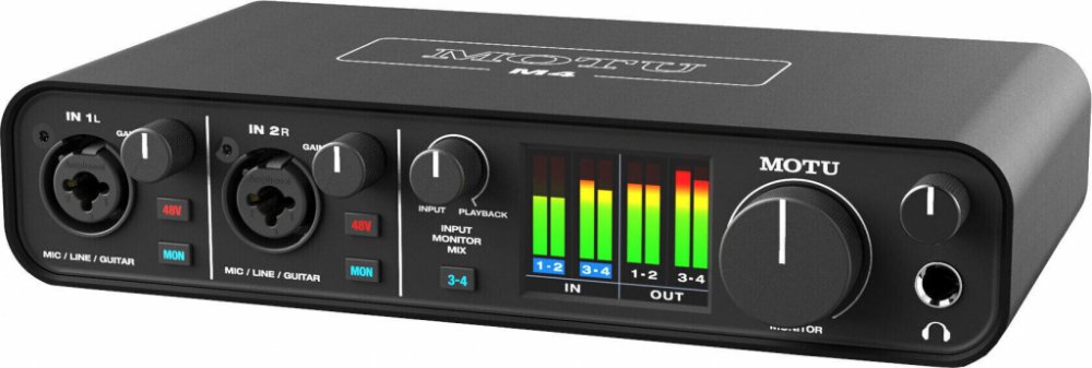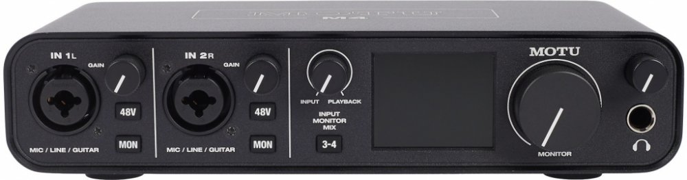 USB-C zvuková karta, 24-bit/192kHz, vstupy: 2x linkový/mikrofonní (XLR/Jack 6.3, phantom), 2x linkový (jack 6.3), výstupy: 4x mono (Jack 6.3), 4x mono (RCA cinch), 1x sluchátka, MIDI IN/OUT, funkce loopback, v ceně SW MOTU Performer Lite, Ableton Live Lite a 6 GB smyček a samplů