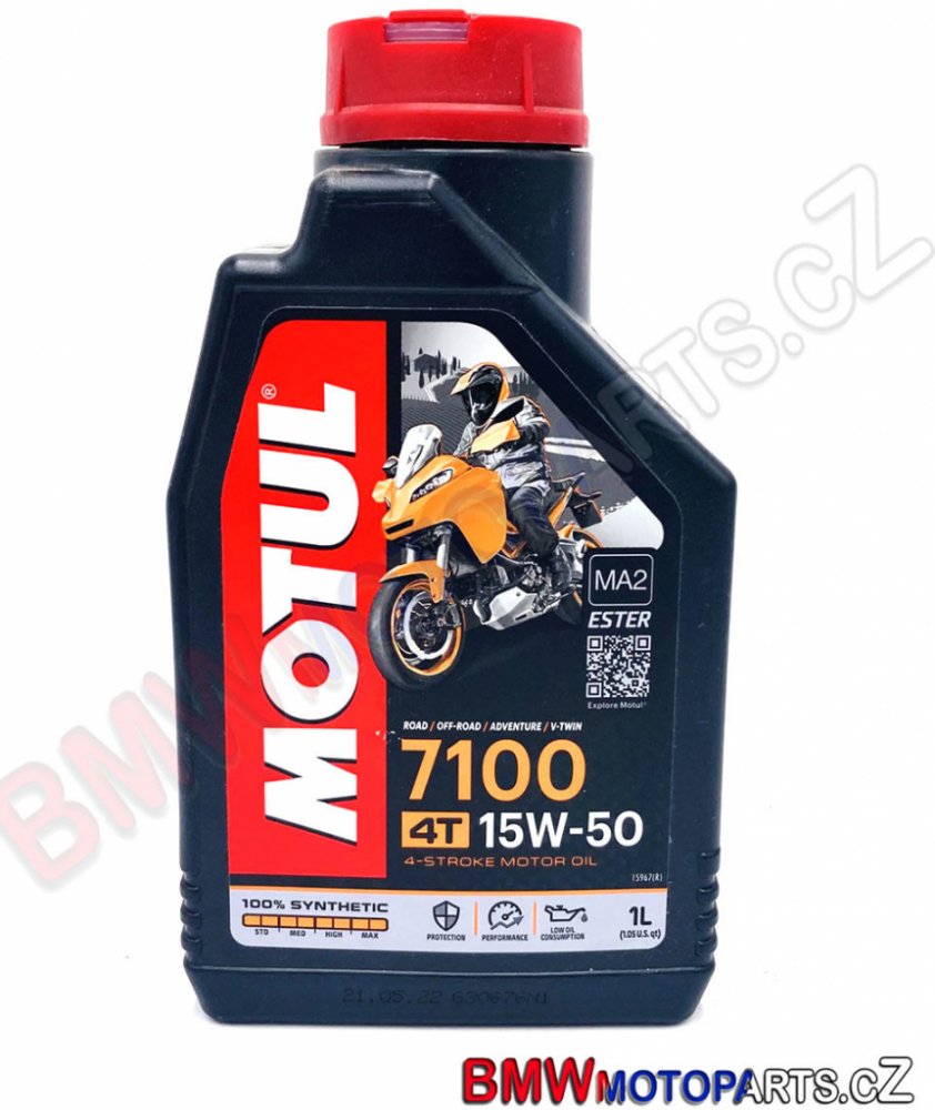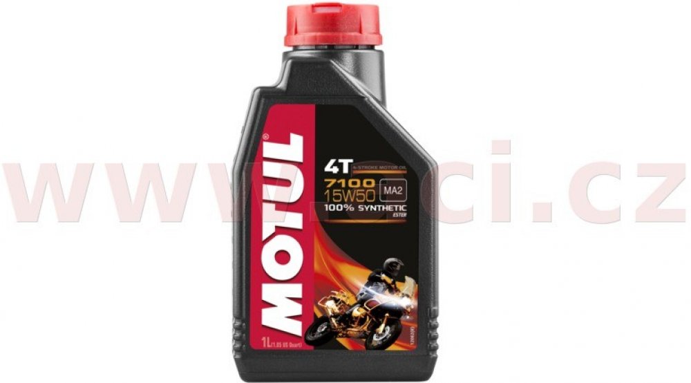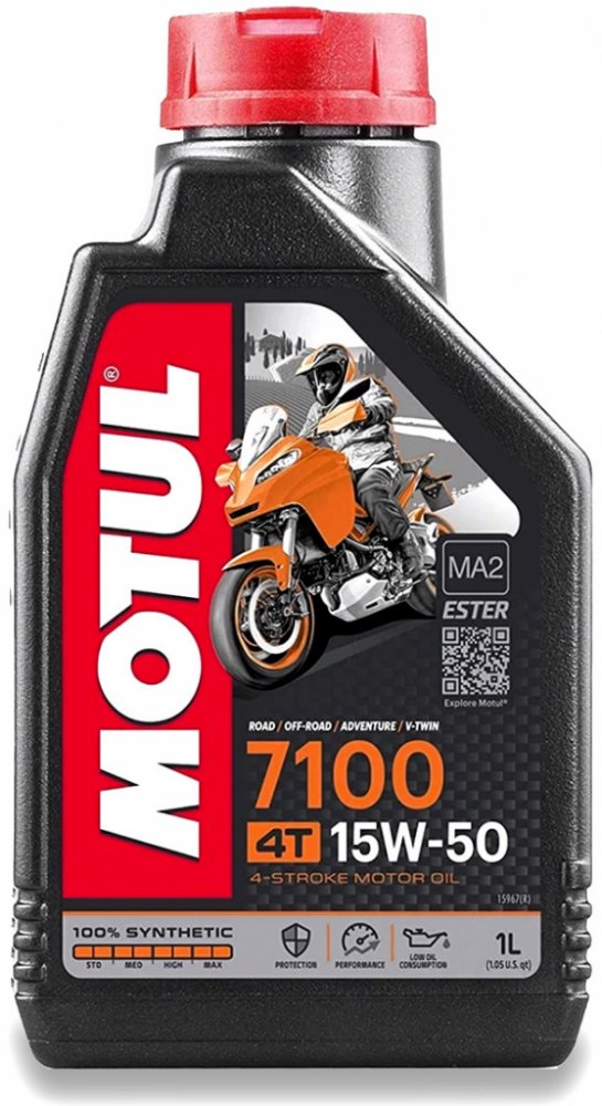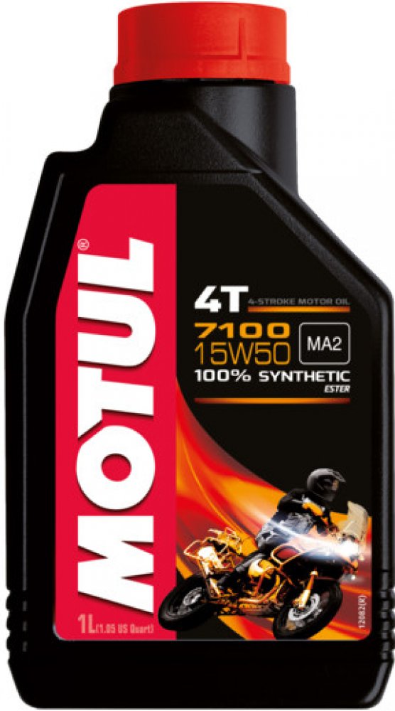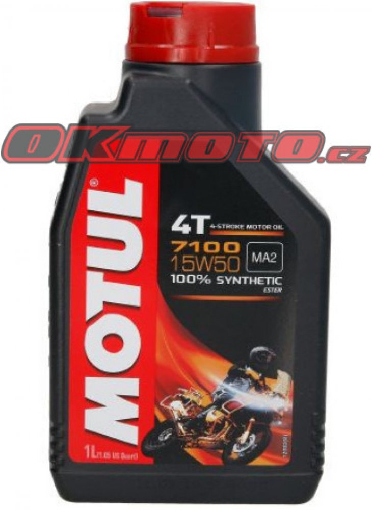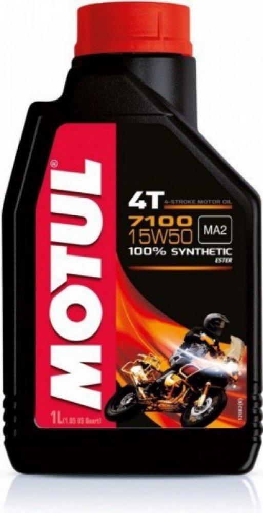 Motul 7100 4T 15W-50 je 100% syntetický motorový olej pro vysoce výkonné, sportovní, silniční a terénní motocykly se čtyřtaktním motorem, s integrovanou suchou nebo mokrou spojkou a převodovkou, splňující emisní předpisy Euro 2 nebo Euro 3, šitý na míru novodobým Air Injection. Doporučen téměř všemi výrobci motocyklů na světě.