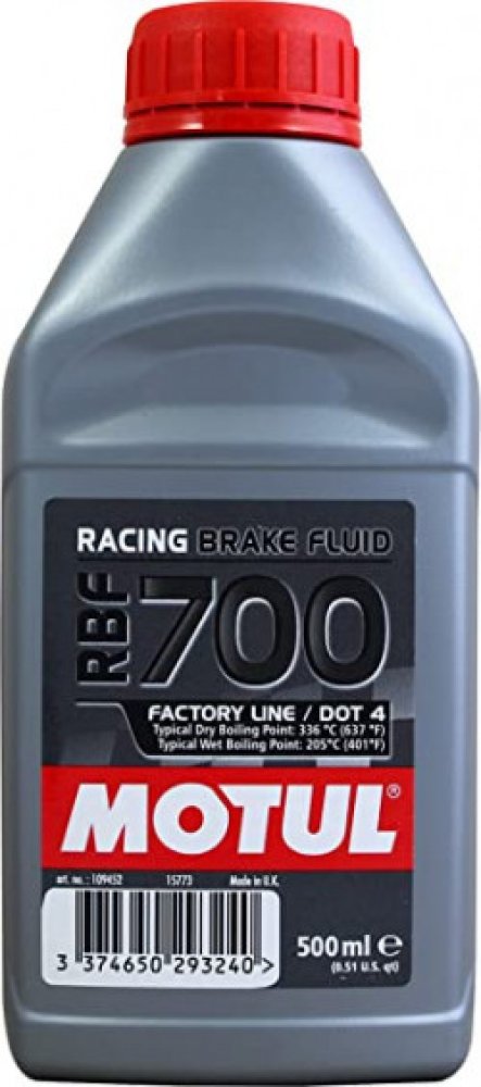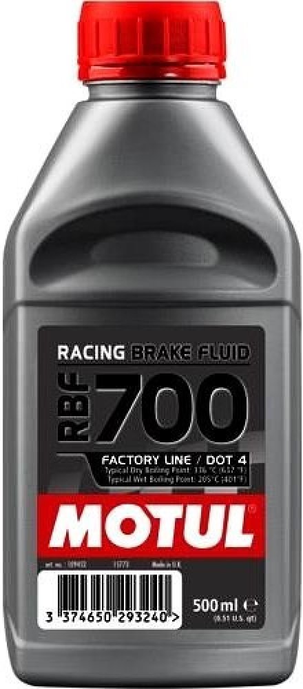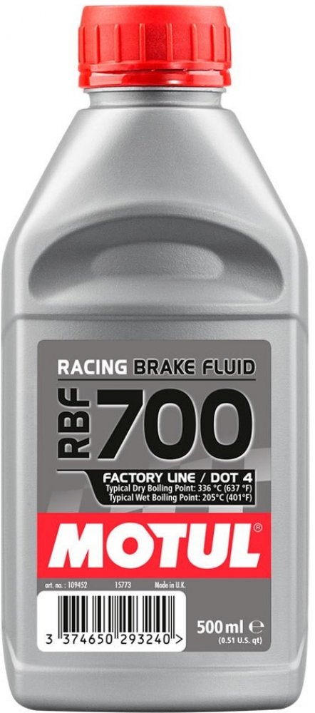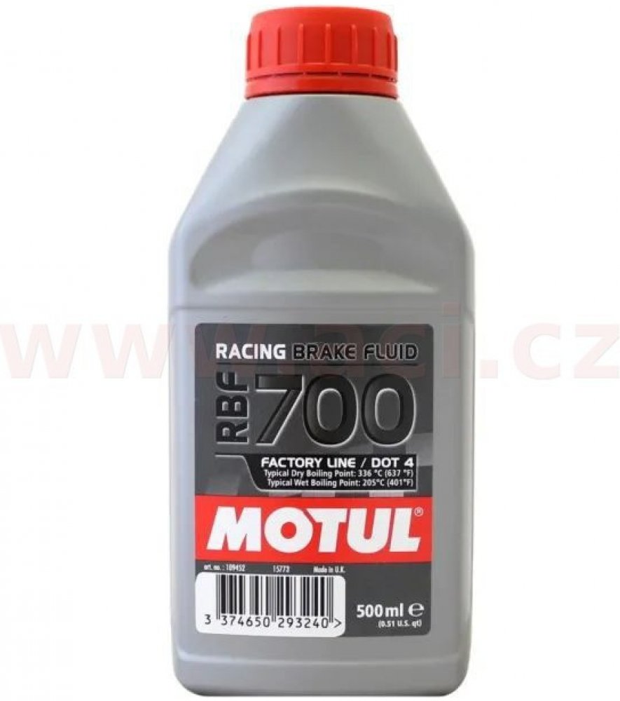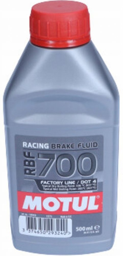 Motul (Racing Brake Fluid) RBF 700 je vysoce výkonná brzdová kapalina vyvinutá pro zajištění vysoce stabilního a maximálního brzdného výkonu při extrémních teplotách při provozu závodních uhlíkových a keramických brzd. Umožňuje minimalizovat přítomnost vzduchových otvorů potřebných pro chlazení brzd, čímž snižuje aerodynamický odpor. Lze ji používat u běžných ocelových kotoučů. Lze ji používat pro...