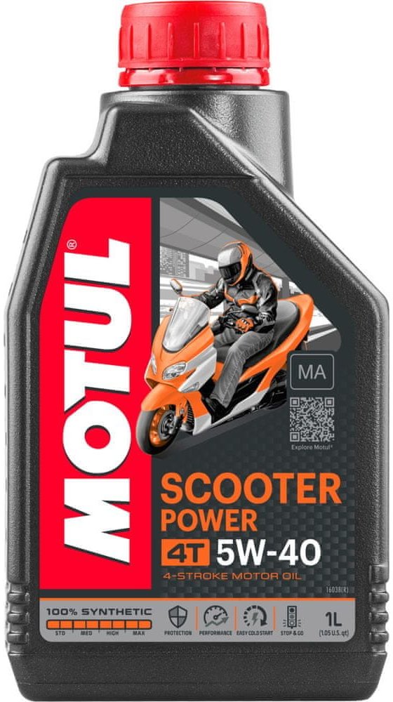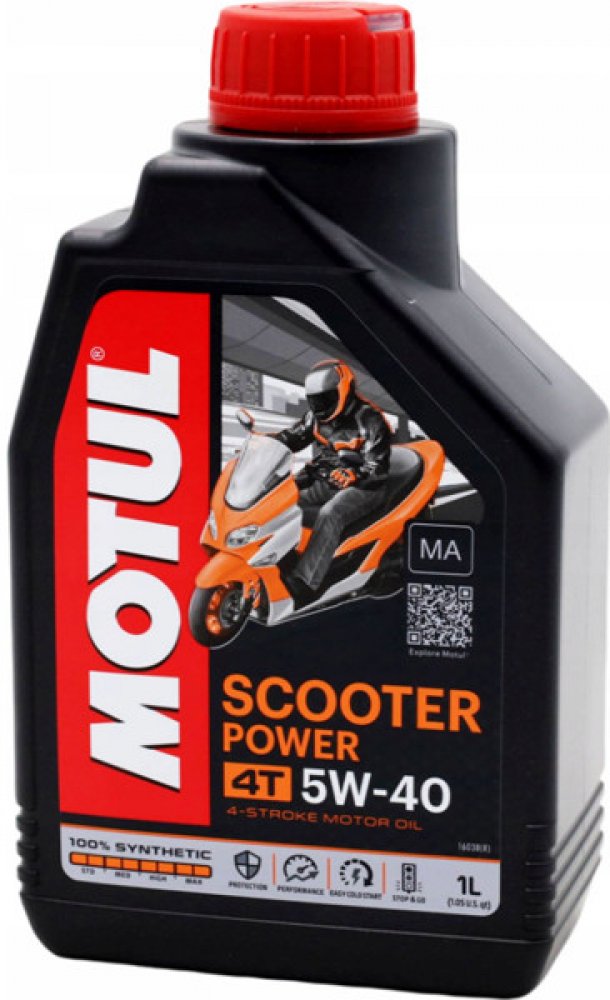 100% syntetický olej vyrobený na základě Ester-Technology určený pro silné a moderní skútry a maxi skútry vybavené 4-taktními motory od 50 ccm do 650 ccm. SAE 5W-40 viskozitní třída odpovídá posledním požadavkům výrobců na snížení opotřebení.