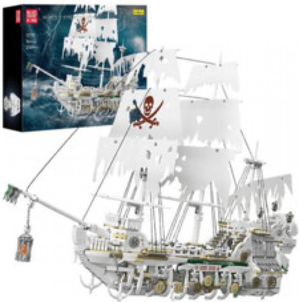Stavebnice pirátské lodi Mould King. Vody brázdí jako bílý duch moří. Loď má roztrhané plachty a paluba je složená z kostek ve tvaru kostí.