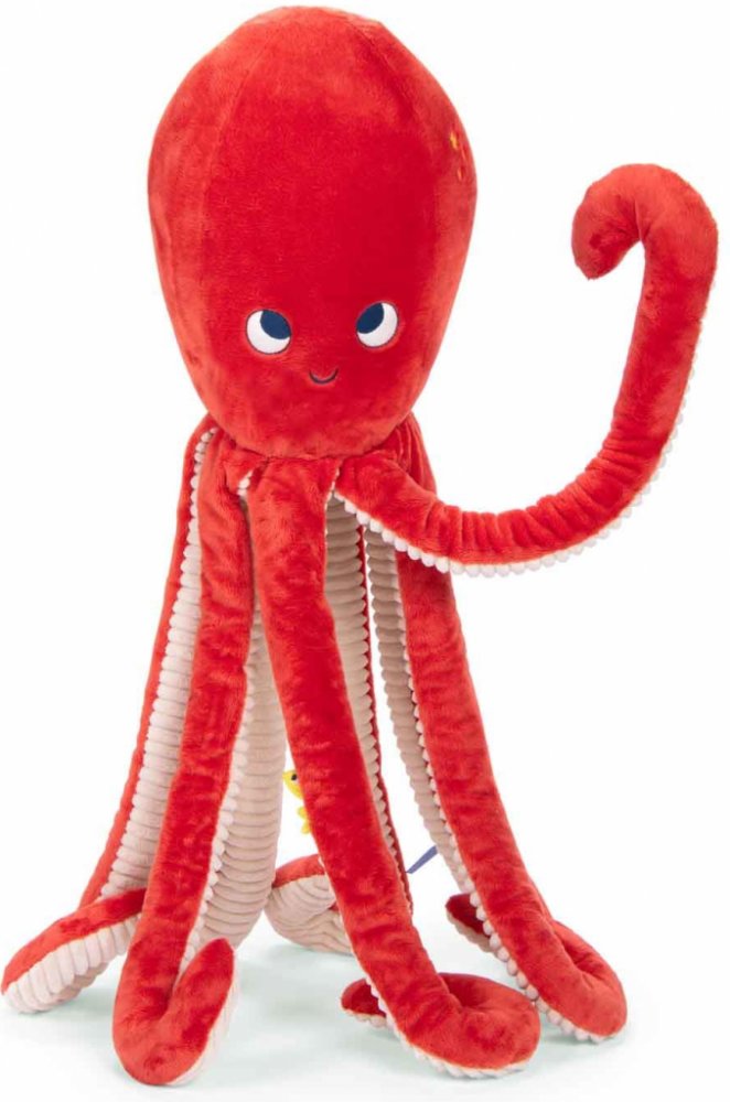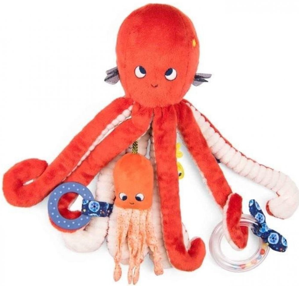 Chobotnice Paulie ve svých 8 žebrovaných chapadlech skrývá mnoho aktivit: rolničky, kroužek s barevnými kuličkami, štítky a uzel k uchopení, kroužek na kousání a dokonce i malého chrastícího společníka.Rozměr: 35 cm.Praní na 30° vlnu. Bez sušičky.Materiál: Plast, polyester