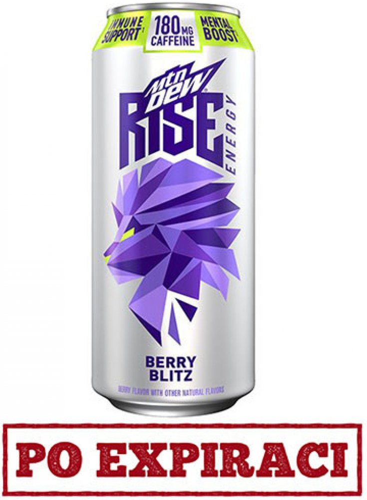 Energetický nápoj Mountain Dew Rise nízkokalorický s příchutí bobulí Složení: sycená voda, džus z bílých hroznů z koncentrátu, kyselina citrónová, polyfosfáty sodné (konzervant), přírodní aroma, citicolin, kofein, kyselina askorbová (vitamín C), aspartam, arabská guma, sorbát draselný (konzervant), acesulfam draselný, sukralóza, niacinamid (vitamín B3), glycerol ester dřevěné kalafuny, dvojsodný vápník EDTA (konzervant), pantothenát vápenatý (vitamín B5), acetát isobutyrát sacharózy, sulfát zinečnatý, umělá barviva (červeň Allura AC), pyridoxin hydrochlorid (vitamín B6), betakaroten (vitamín A) Energetická hodnota na 100ml Energie 22 kJ/5 kcal Tuky 0g z toho nasycené 0g Sacharidy 1,1g z toho cukry 0,9g Bílkoviny 0g Sůl 0g Tento produkt není vhodný pro děti, osoby citlivé na kofein, těhotné a kojící ženy.