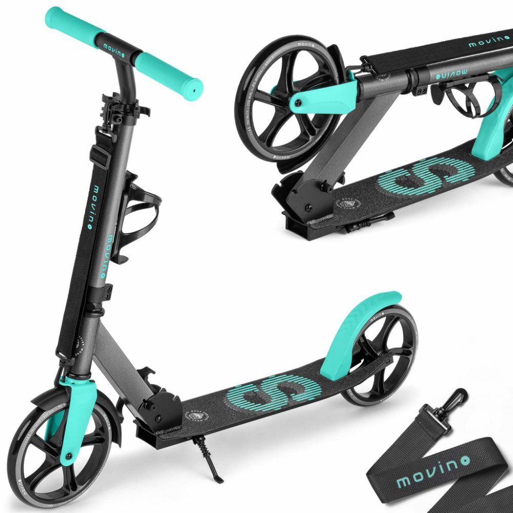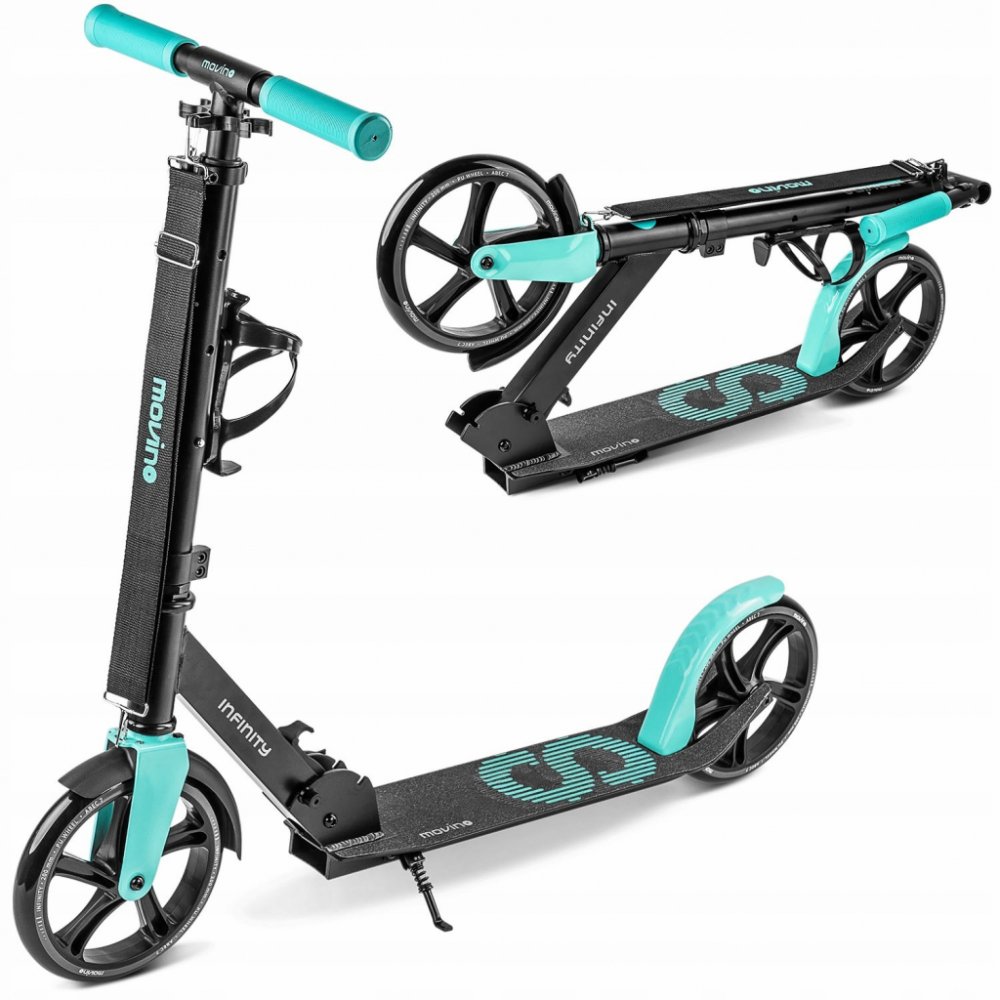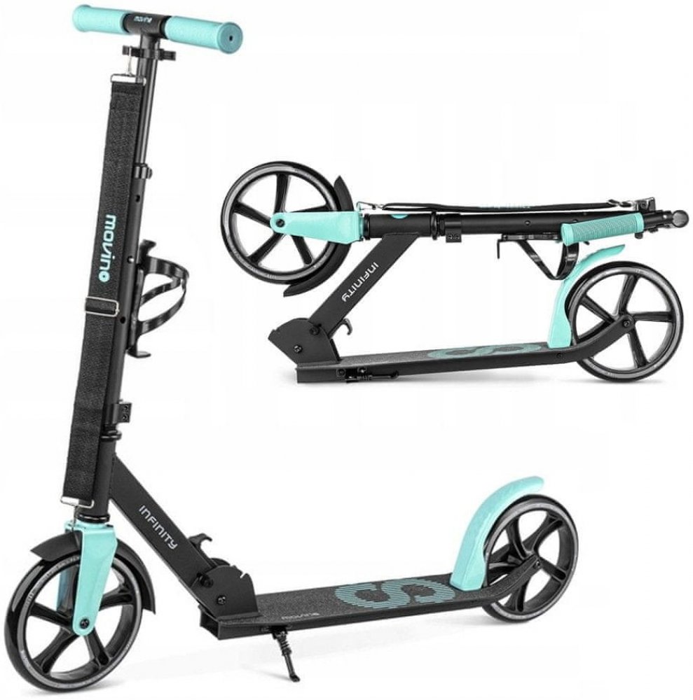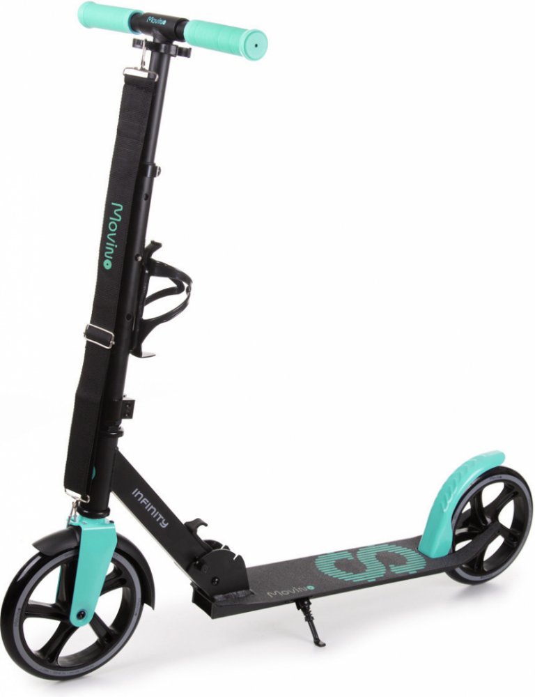 Movino Infinity je pohodlná městská koloběžka pro děti a mládež, která je oblíbená především na cesty do školy. Má nízko zavěšenou desku, kterou ocení mladší uživatelé. Model Infinity byl vybaven praktickým příslušenstvím: přepravním popruhem a držákem na láhev.