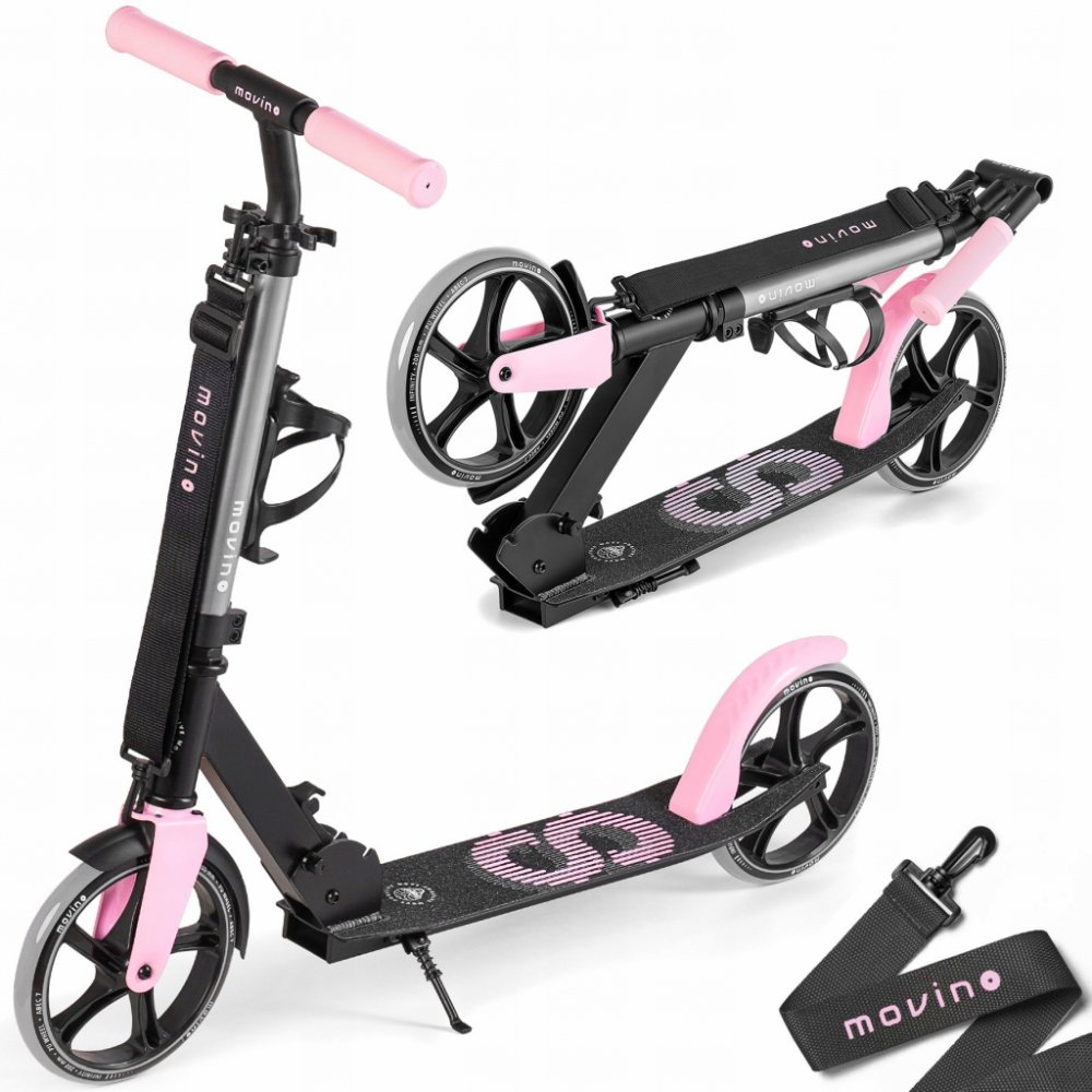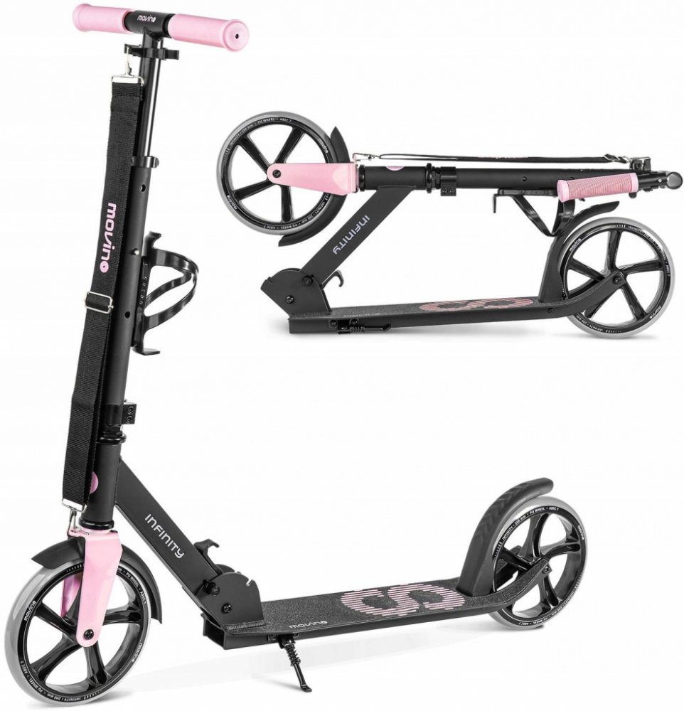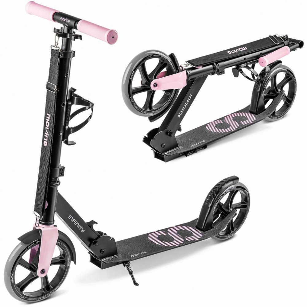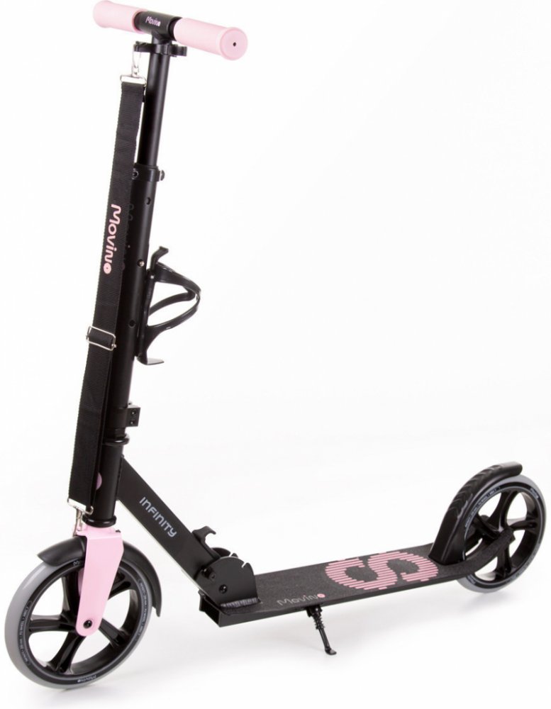 Movino Infinity je městská koloběžka vytvořená pro děti i dospělé. Nízká zavěšená plošina (7 cm od země). V horkých dnech můžete použít držadlo na láhev s vodou na řídítkách. Celek se snadno skládá a přenáší.