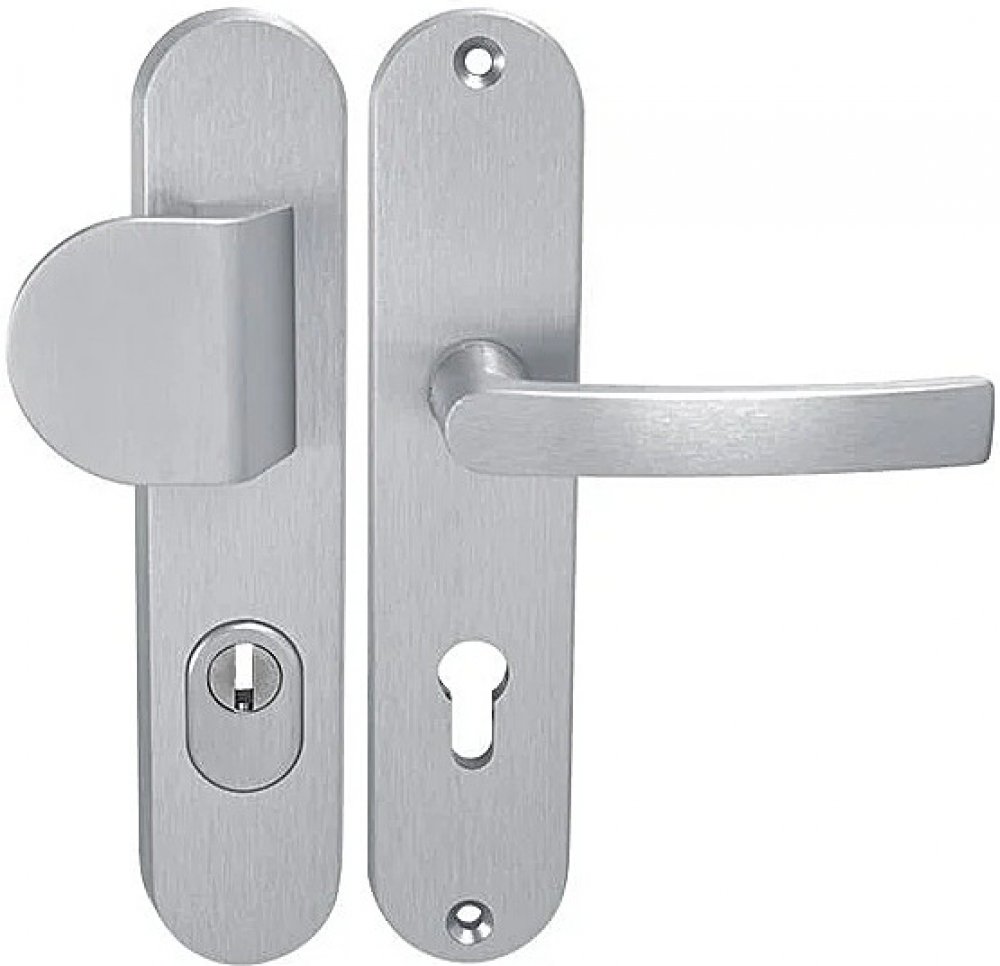 Štítová klika na vchodové a bezpečnostní dveře s bezpečnostním oválným štítem s překrytím cylindrické vložky je vyrobena z hliníku a je povrchově upravena. Oválný štít má rozměry 52 mm x 242 mm a tloušťku 15 mm.