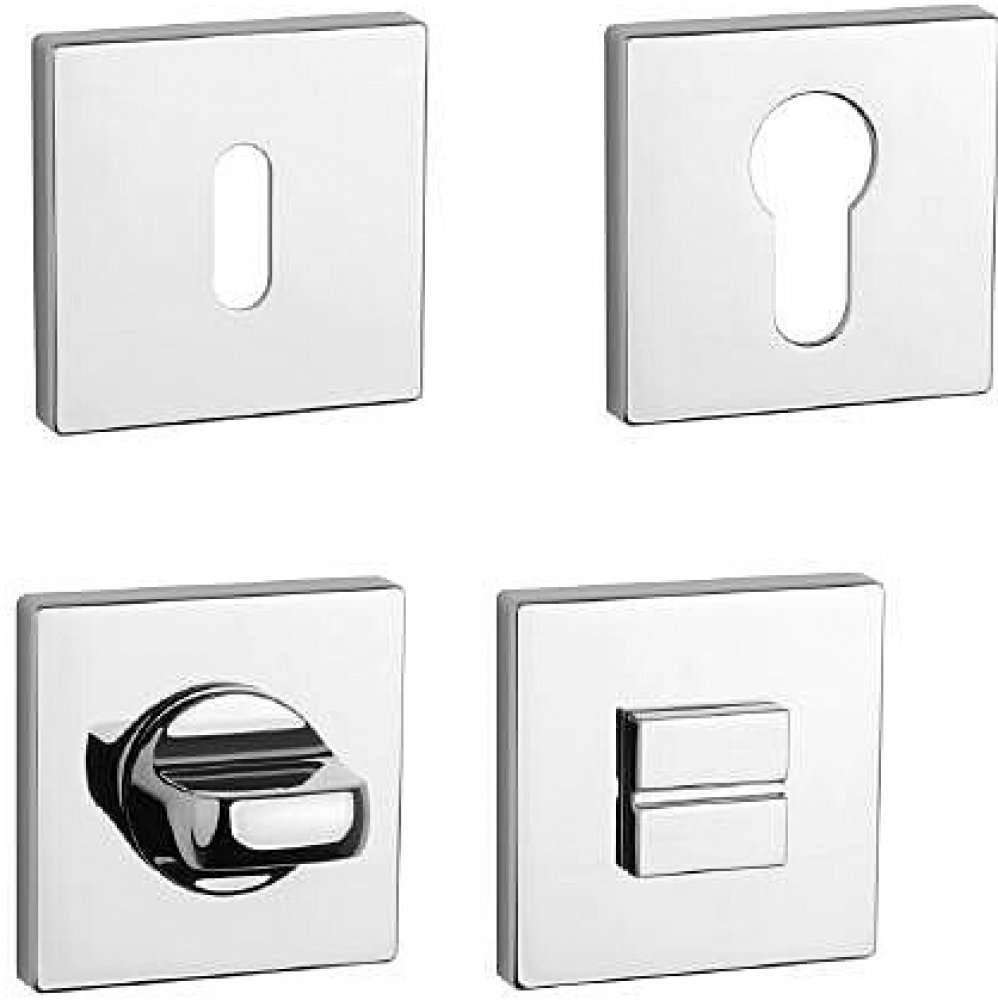 Hranatá rozeta je vyrobena z materiálů vysoké kvality - zamak a je povrchově upravena. Rozeta má rozměr 52x52 mm, tloušťku 7 mm a oválný otvor pro interiérový klíč (BB), otvor pro cylindrickou vložku (PZ), WC set s vmontovaným klíčem. Balení obsahuje 2 kusy rozet (pár) a rozety WC jsou v balení jako set.