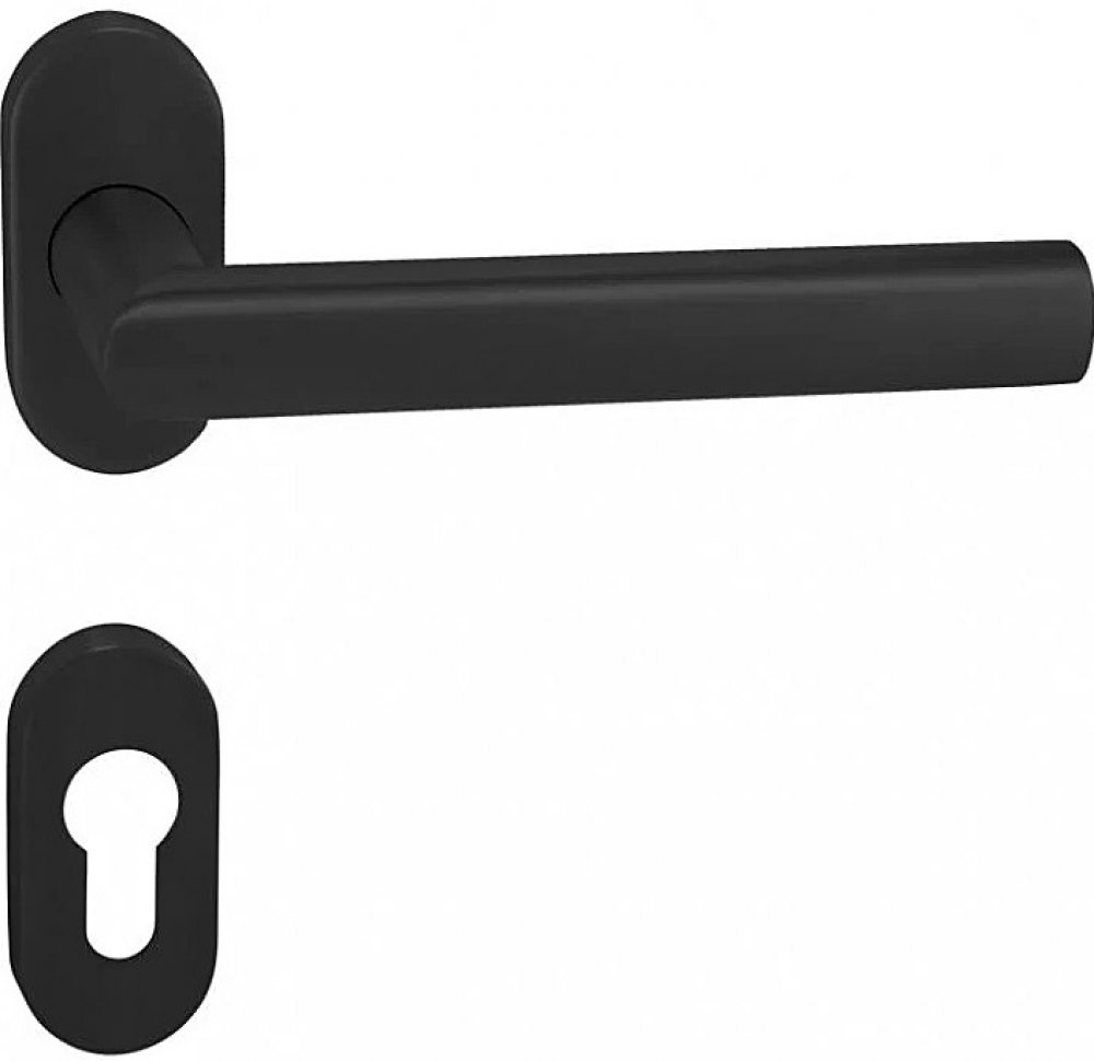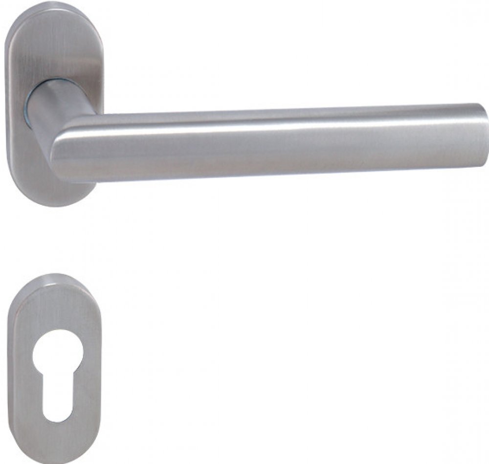 Rozetová klika s oválnou úzkou rozetou pro dveře s úzkým profilem (např.: zahradní branky a braničky plotů).
