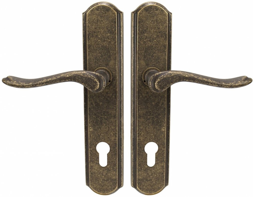 Štítová klika na vchodové a bezpečnostní dveře se zpevněným rustikálním štítem bez překrytí cylindrické vložky je vyrobená z materiálů vysoké kvality – mosaz a je povrchově upravená.