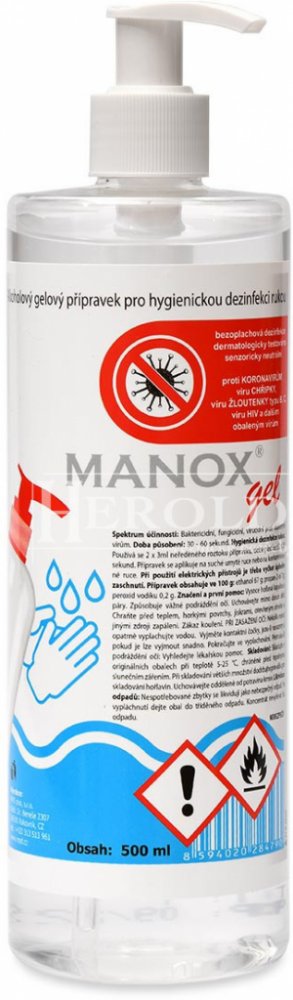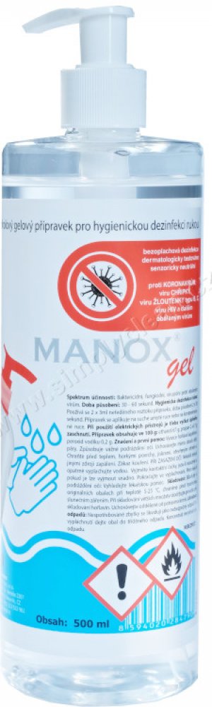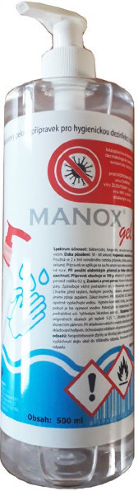 Manox gelový přípravek určený na hygienickou dezinfenci rukou.