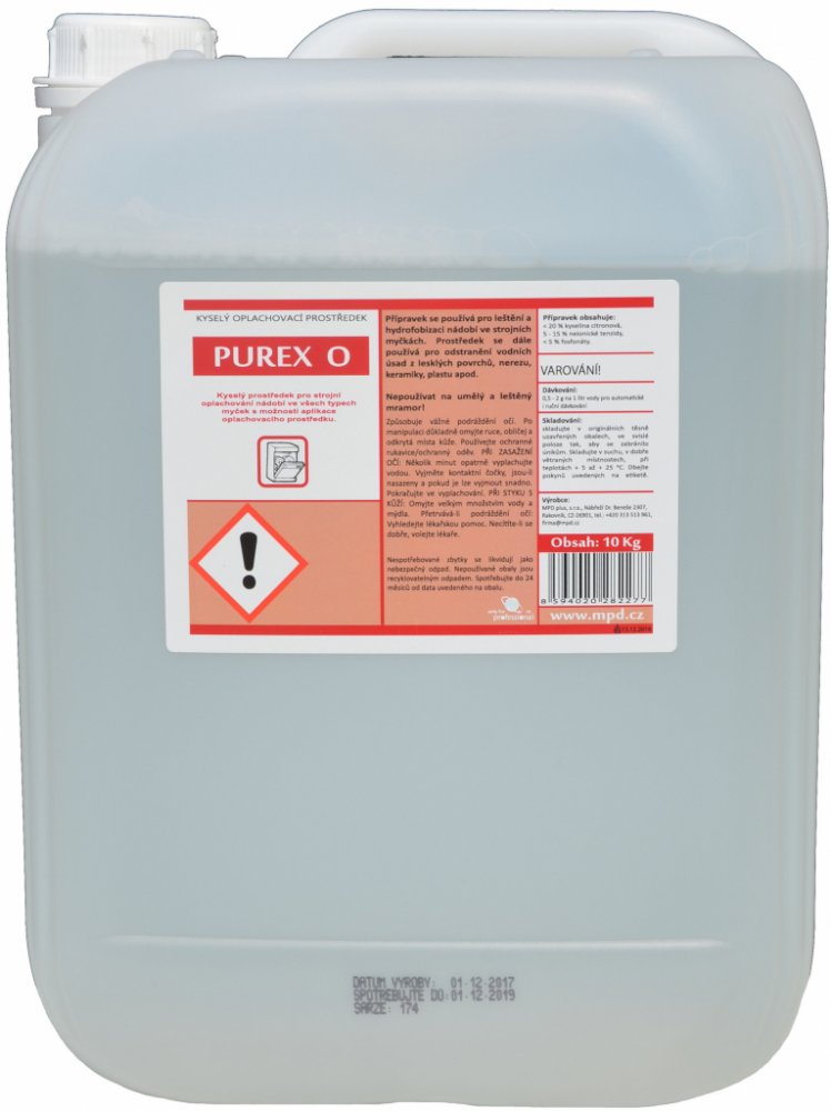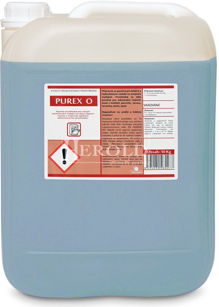 Kyselý tekutý oplachovací, leštící a sušící detergent, určený pro všechny myčky, které umožňují dávkování oplachového prostředku. Purex O snižuje množství vody a vápenatých usazenin na povrchu nádobí. Skleněné povrchy získávají původní lesk a dochází ke snažšímu sušení. Je určen pro použití v kombinaci s alkalickým mycím prostředkem.