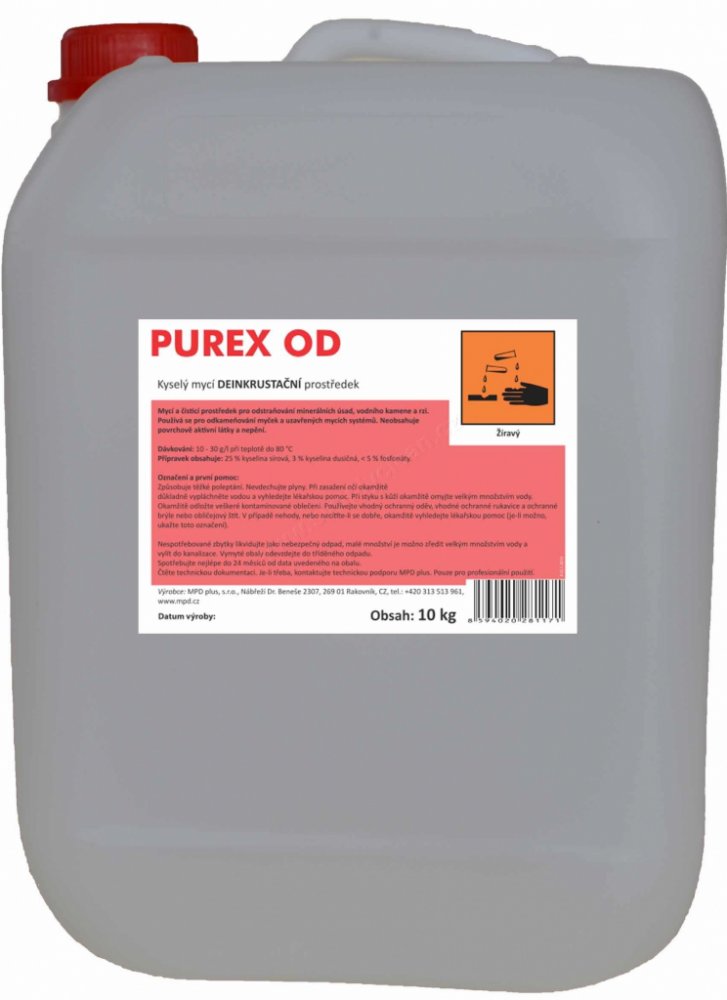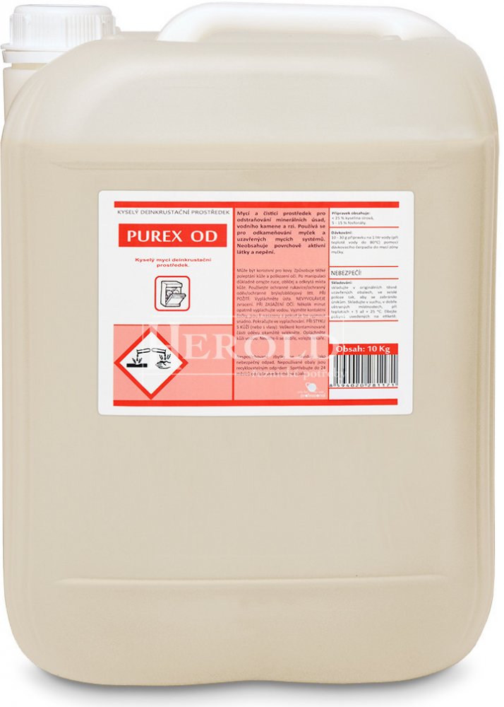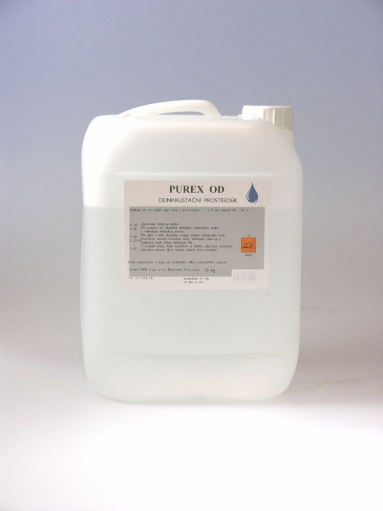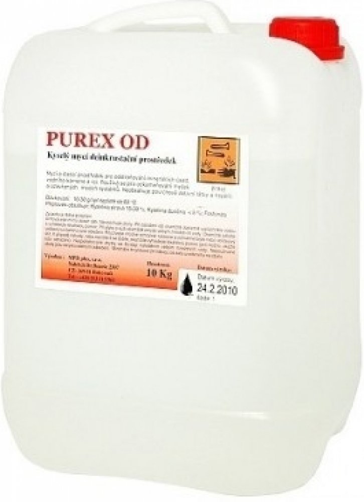 Purex OD je kyselý mycí a čistící prostředek pro odstraňování minerálních úsad, vodního kamene a rzi. Používá se především pro odkameňování myček a uzavřených mycích systémů. Přípravek neobsahuje povrchově aktivní látky a nepění. Je založen na rozpouštění minerálních úsad pomocí silných minerálních kyselin a komplexotvorných přísad.