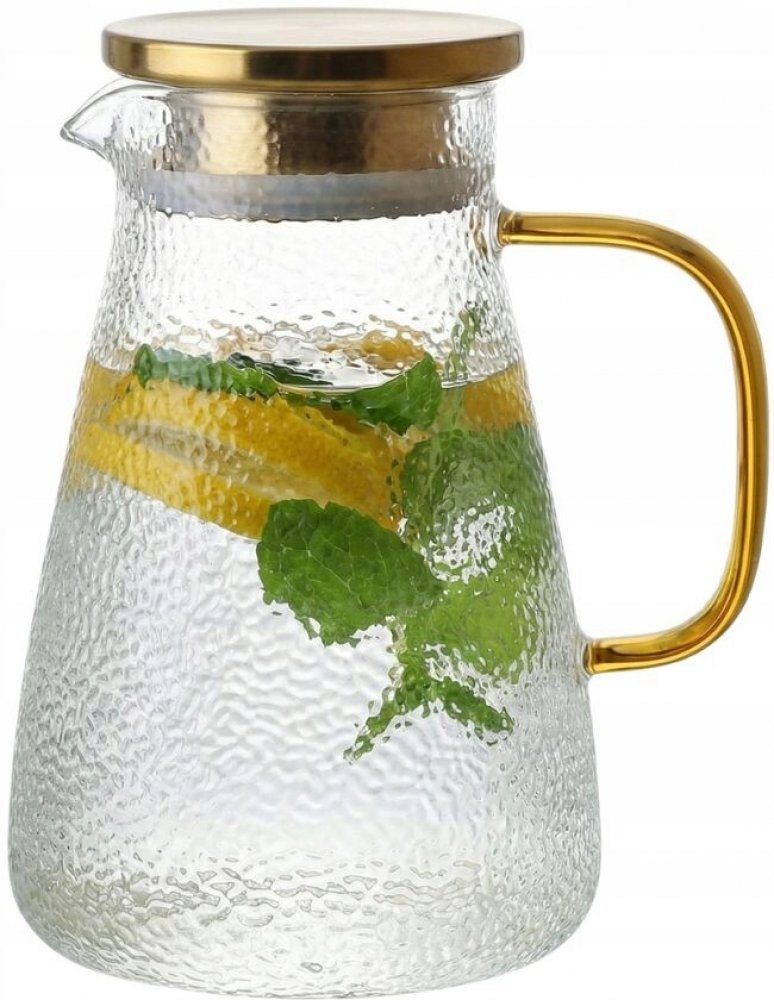 Stylový skleněný džbán Jack o objemu 2,0 l s efektním zlatým víkem je jedinečným prvkem vybavení kuchyně a jídelny. Vyroben z vysoce kvalitního borosilikátového skla, kombinuje estetiku a praktičnost – ideální pro podávání vody, džusů, limonády, ledového čaje, ovocných nápojů nebo koktejlů.