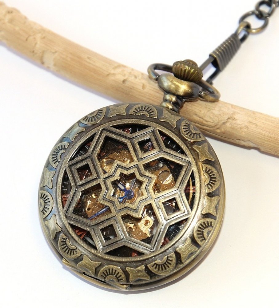 Kvalitní a luxusní kapesní hodinky s otevíracím předním krytem, ve kterém jsou geometrické obrazce a uvnitř se skrývá ciferník s římskými číslicemi, kde uprostřed na obnaženém, zlatém strojku obíhají elegantní úzké nožičky ♥